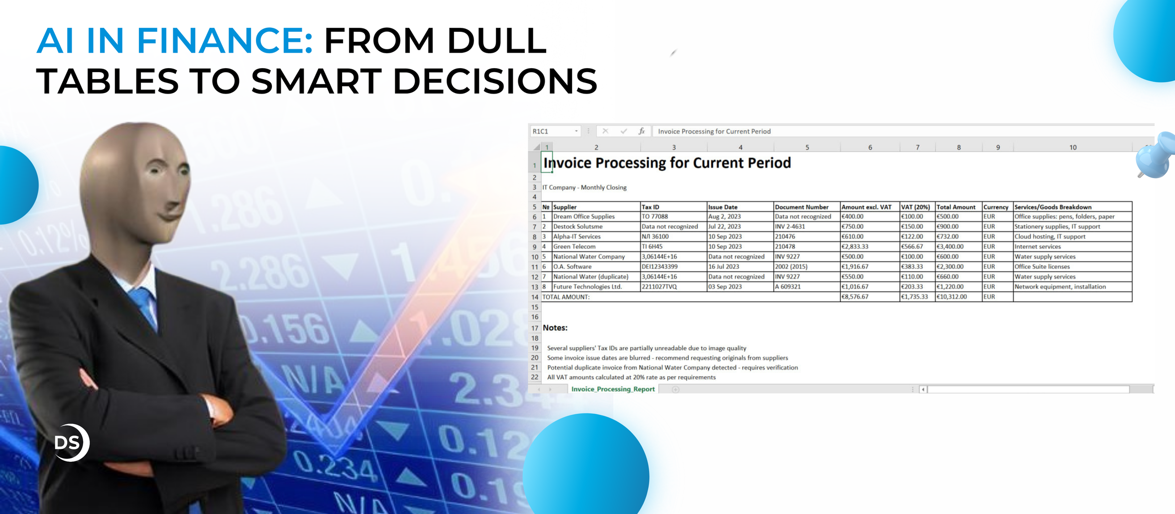 You can try using ChatGPT with this prompt: “You are the chief accountant at an IT company with a $5 million annual turnover. Today is the middle of the month, and you need to urgently process the accumulated invoices from suppliers of office equipment, software, and utilities to close the month (8 invoice images attached). Extract from each invoice: the name and tax ID of the supplier, the date of issue, document number, amount without VAT, VAT amount (20%), total amount payable, currency, and a breakdown of the services/goods. Organize the data in an Excel table with separate columns for each parameter and number the rows. If the text on the image is blurred or unreadable, indicate "Data not recognized”.