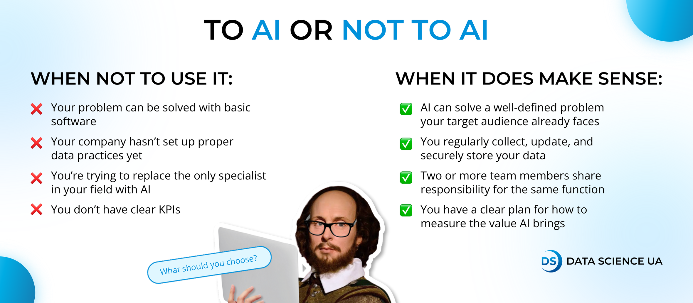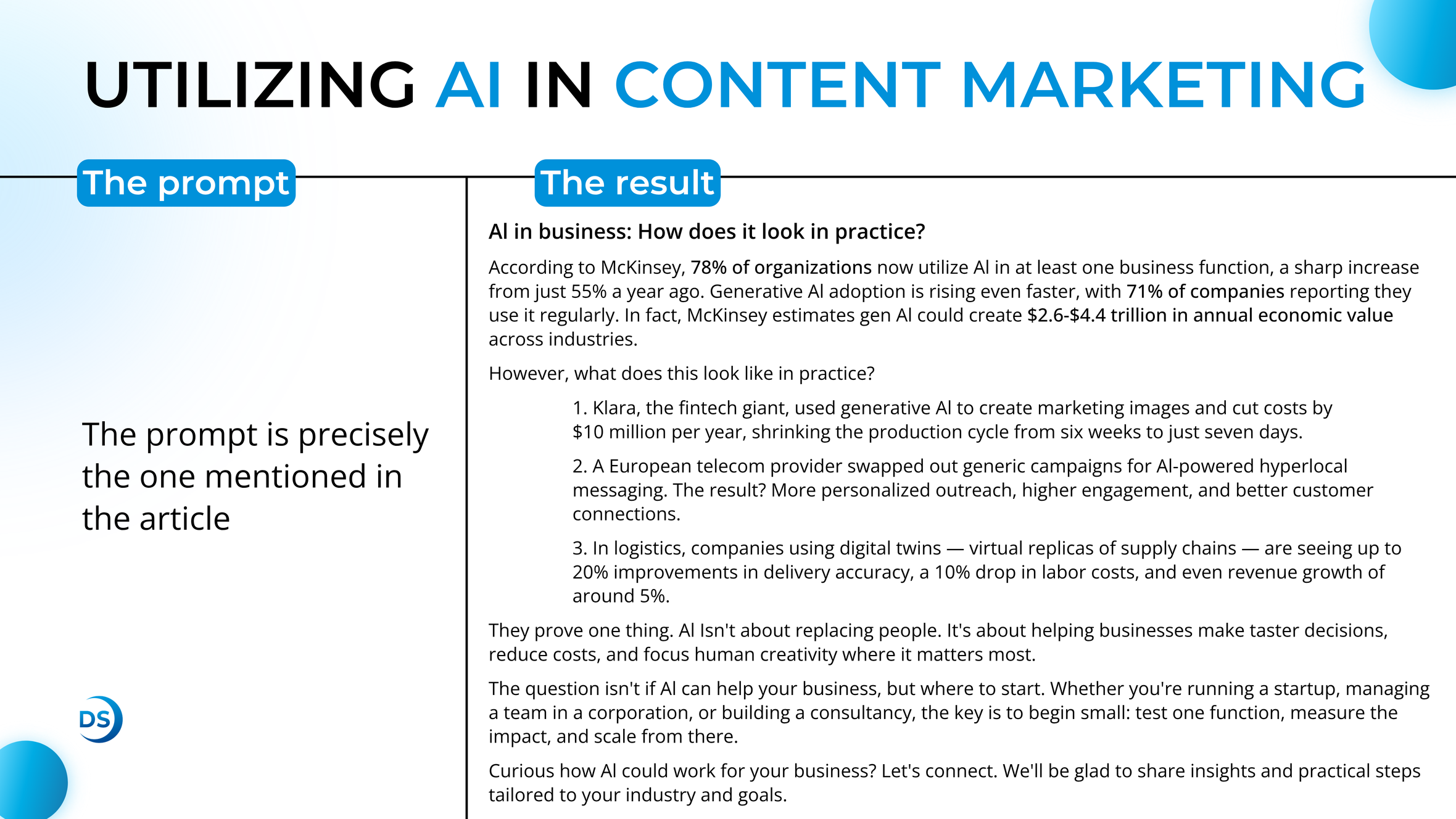 All of the previous methods are useful if you want to quickly test the capabilities of AI and see the first results tomorrow: reduce the time needed to prepare content, speed up customer responses, or get analytics that were previously unavailable. If you're just discovering AI and want to experience what results it can produce, these solutions are perfect for you.