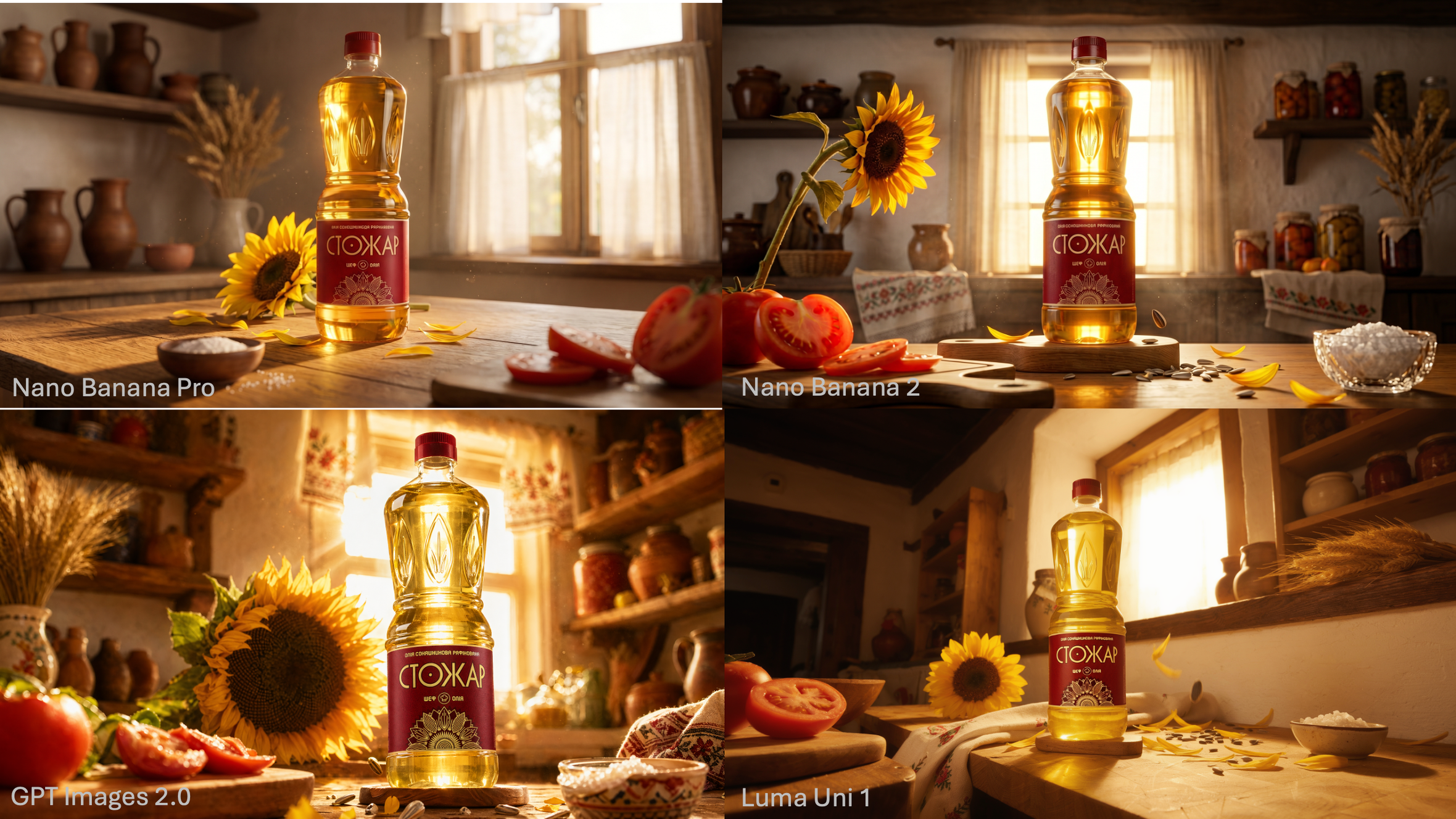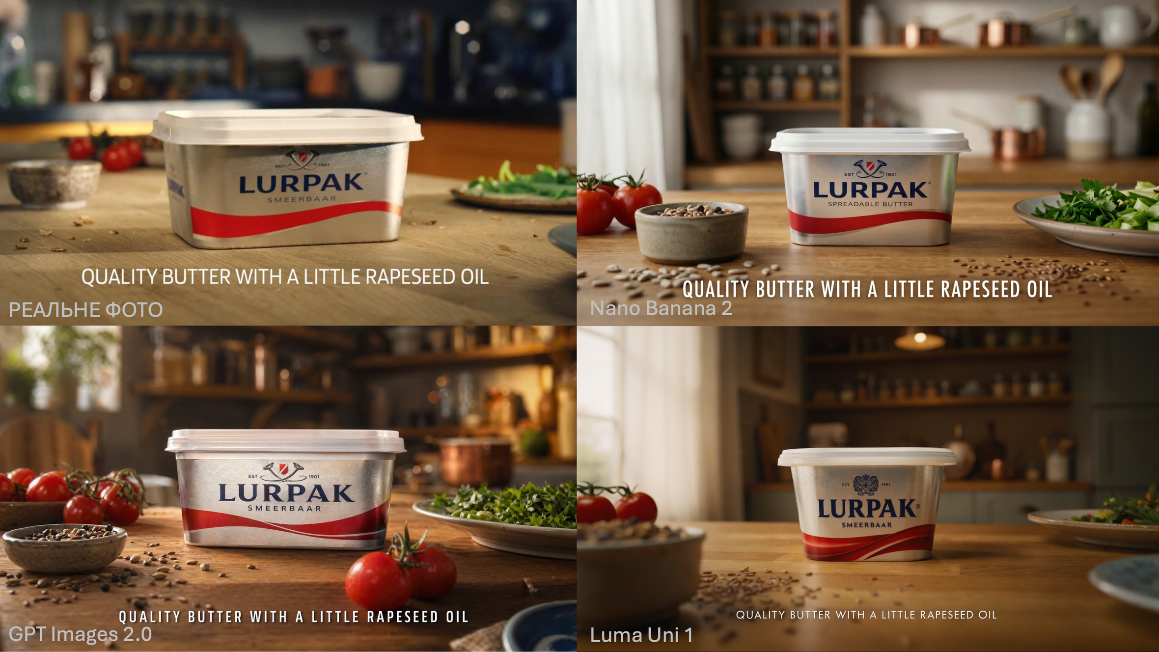 - Luma Uni 1 дає найчистішу композицію, але упаковка маргарину явно менша, ніж має бути — пропорції "попливли". Це характерна помилка моделей: вони не тримають фізичний розмір об'єкта відносно середовища.
