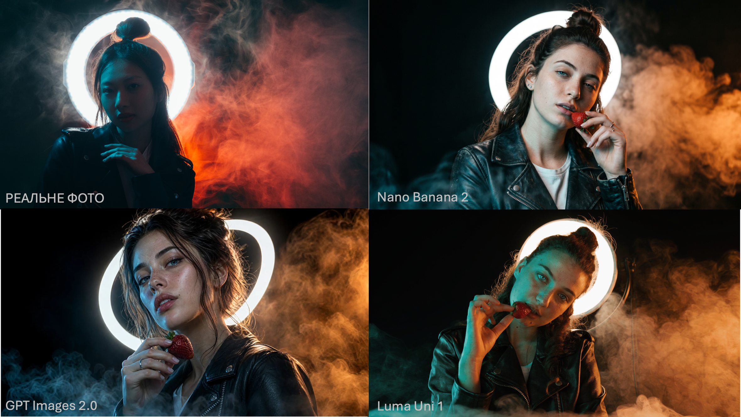 - Nano Banana 2 дає чистий портрет з димом, але дим виглядає як стокова текстура, накладена зверху. У реальному кадрі дим переломлює світло, у згенерованому — просто лежить шаром.