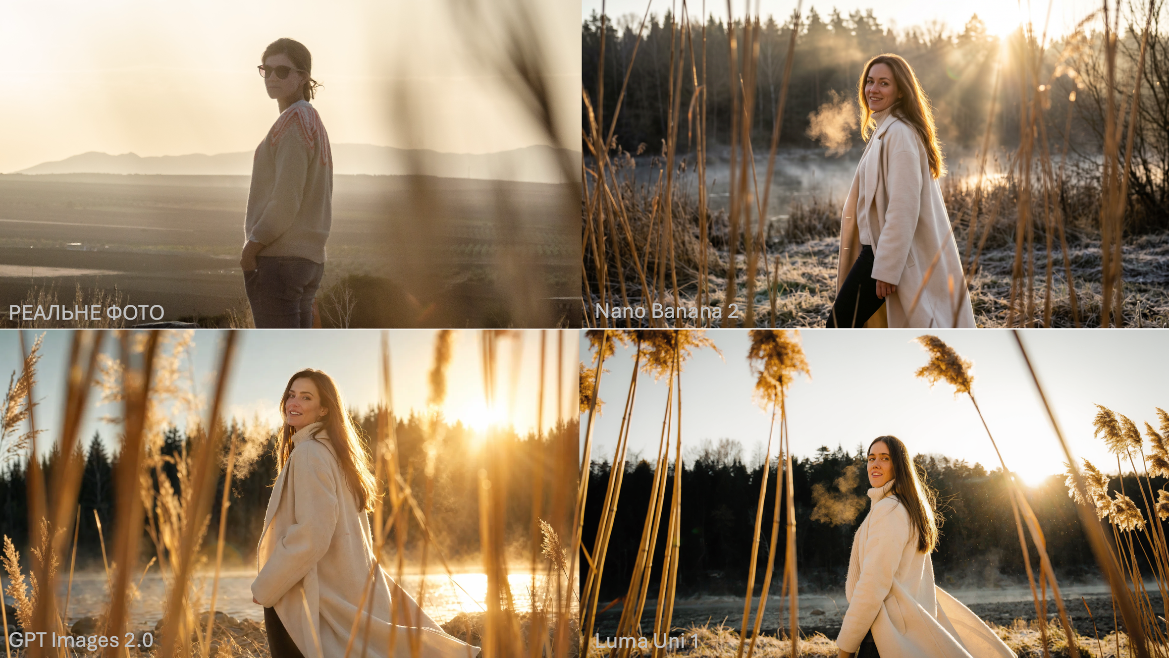 - Nano Banana 2 і GPT Images 2.0 дають технічно красиві зображення — з rim light на волоссі, з теплим градієнтом неба. Але обидва роблять обличчя надто чітким для такого контрового світла. Фізично це неможливо: якщо сонце за моделлю такої яскравості, обличчя має бути у глибокій тіні або з сильним filter-світлом спереду. Нейромережа "дорисовує" його з нічого.