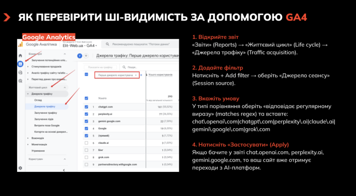 4. Дослідження AI-трафіку в системах аналітики. У 2026 році частину переходів із генеративних платформ уже можна ідентифікувати. У GA4 можна сегментувати джерела сеансів і виділити переходи з AI-платформ, після чого оцінити їхню конверсію, глибину перегляду та поведінкові сценарії.