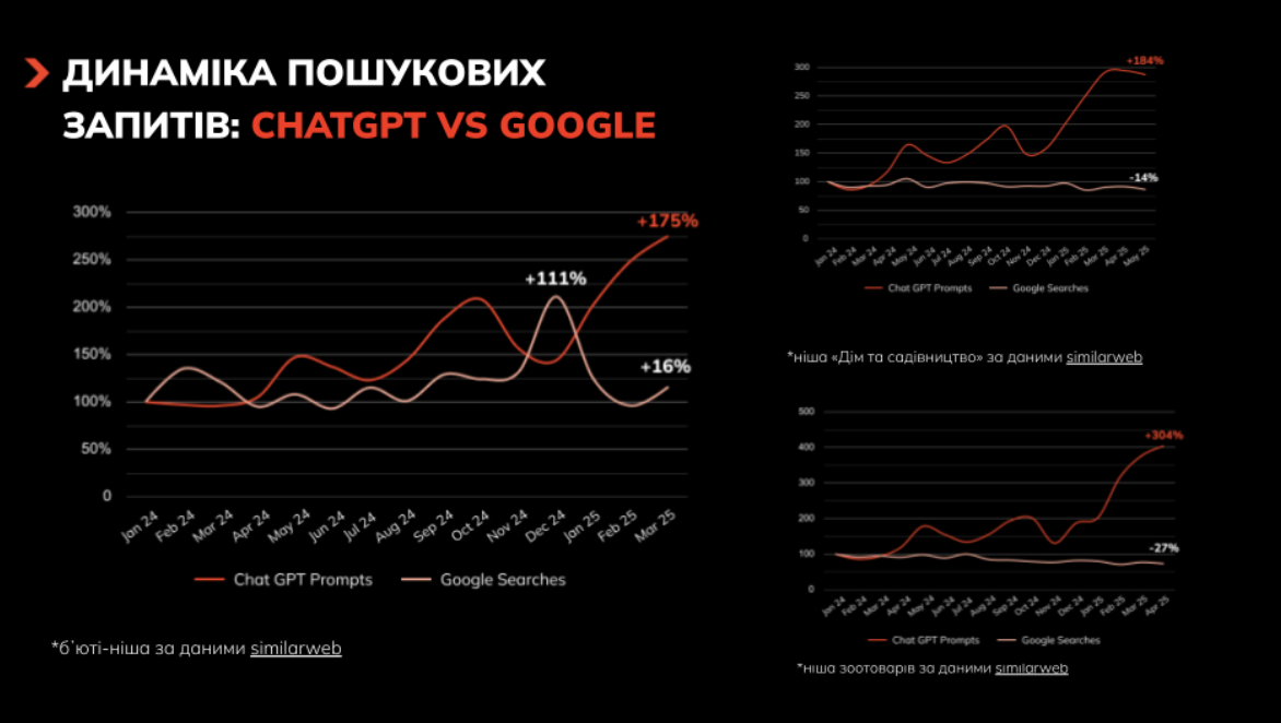 Статистика свідчить, що AI-видача вже впливає на розподіл попиту. Можна побачити, як змінюється динаміка пошукових запитів у ChatGPT Prompts і Google Searches у нішах «Дім та садівництво», «Зоотовари», «Краса». Аналогічна ситуація — і в інших нішах.
