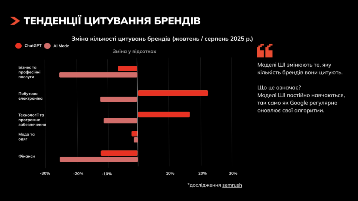 Найчастіше користувачі використовують такі моделі: ChatGPT, Perplexity, Google AI Overviews. Але проблема в тому, що кожна з них базується на дещо різних принципах збору даних, також відрізняються способи подання відповідей. До того ж моделі ШІ постійно навчаються і оновлюються (так само, як алгоритми Google). На діаграмі видно, як змінився відсоток цитувань брендів у різних нішах за кілька місяців.