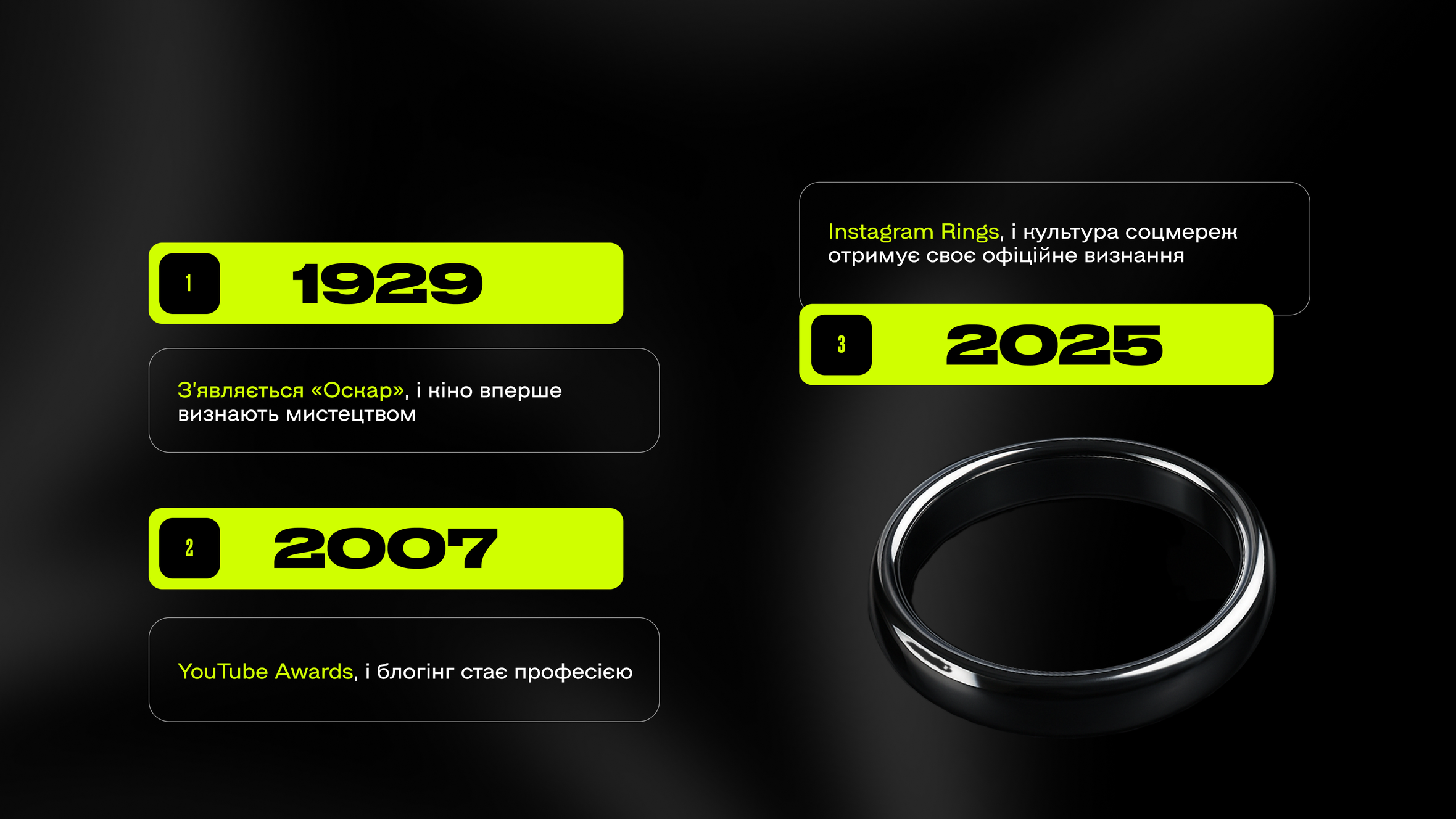 А ще — два кільця: фізичне, золоте, як справжня нагорода, і цифрове — коло навколо аватарки, яке стане новим символом статусу у світі контенту.