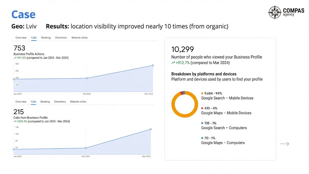 If a dental clinic needs help with a Google Business Profile audit, identifying growth points, review management, local landing pages, and building a systematic Google Maps promotion strategy in Ukraine, you can contact Compas Agency. We help clinics assess the current state of the profile, eliminate technical and reputation weaknesses, and build a practical local strategy for a specific location and service direction.