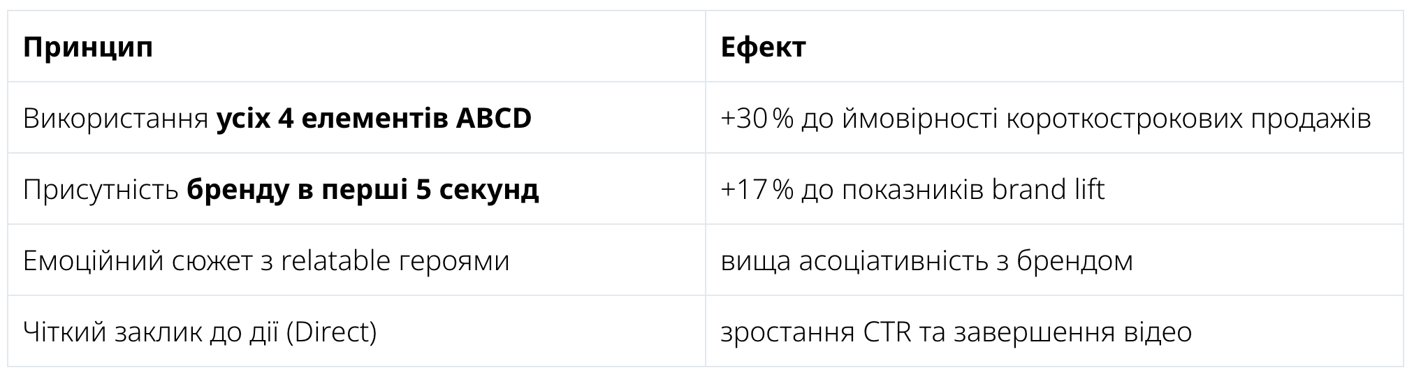 Короткі формати (наприклад, Bumper Ads або YouTube Shorts) мають інші завдання: вони швидше працюють на впізнаваність бренду чи нагадування, ніж на комплексну структуру ABCD. У них неможливо розкрити всі елементи системи, тож вони радше доповнюють довші ролики, а не замінюють їх.