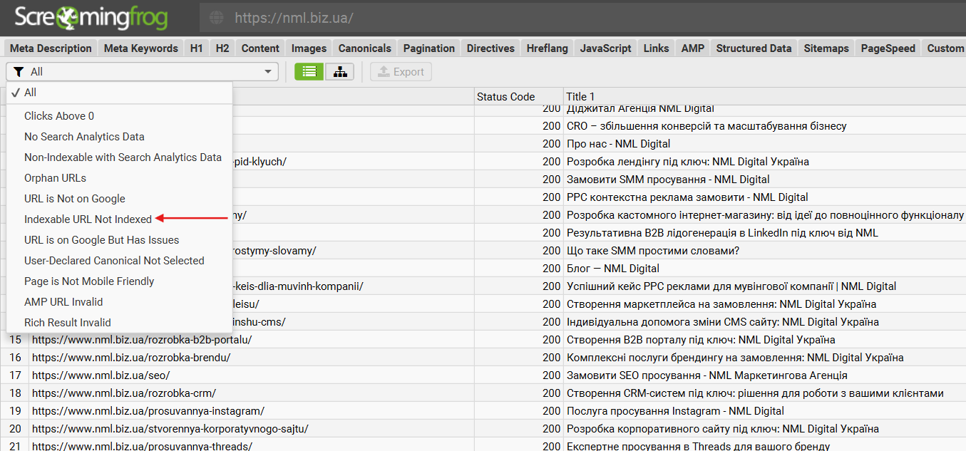 А далі – опанування більше й більше фішок Screaming Frog i Ahrefs. Наприклад, чи знали ви, що під’єднавши акаунт Google Search Console до жаби – можна перевірити індексацію сторінок? Відкриється список сторінок, які відкриті для індексації, але не індексуються.