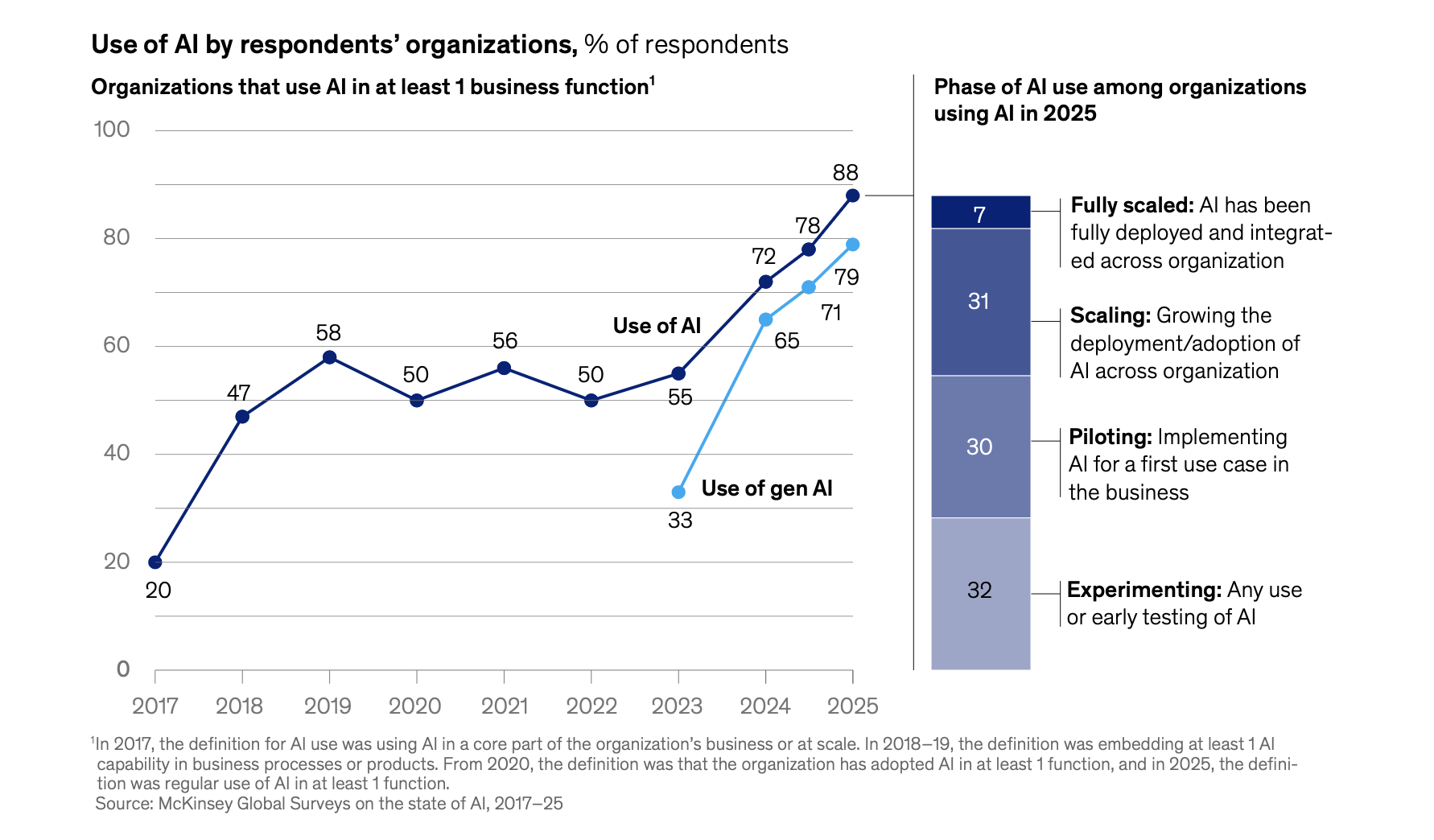 Reported use of AI in at least one business function continues to increase. Source: McKinsey & Company
