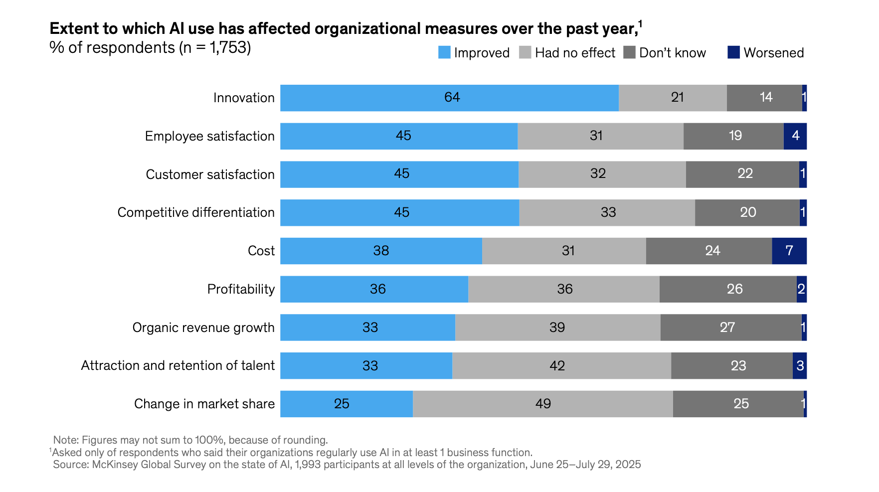 Respondents most often cite benefits from AI in innovation, employee and customer satisfaction, and competitive differentiation. Source: McKinsey & Company