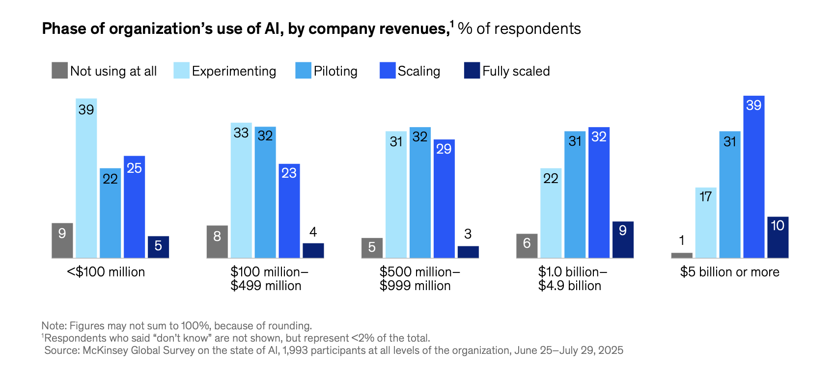 Larger companies lead the way in scaling AI beyond pilots. Source: McKinsey & Company