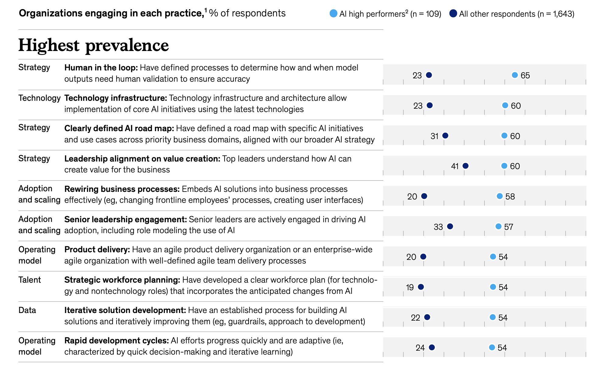 Organizations seeing the largest returns from AI are more likely than others to follow a range of best practices. Source: McKinsey & Company
