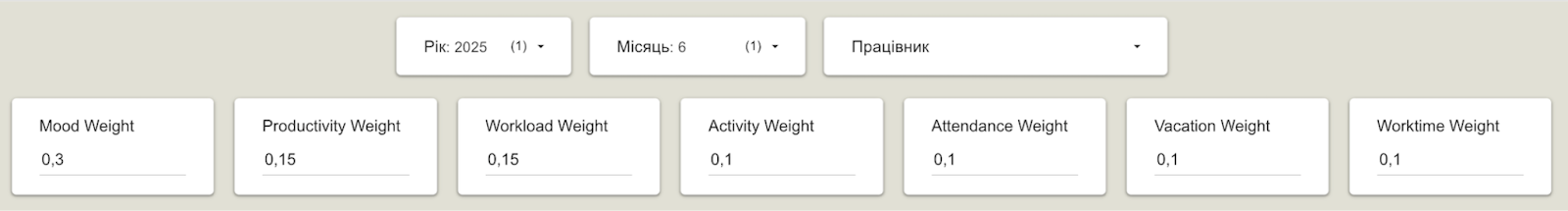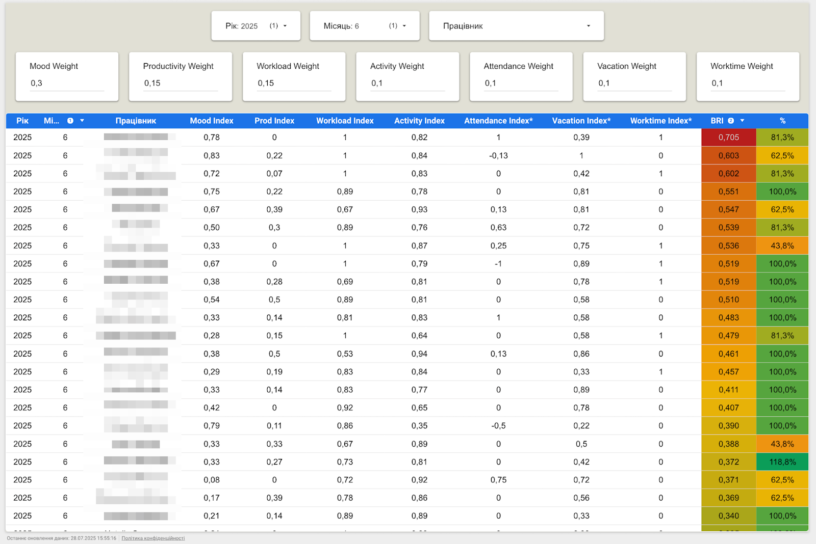 По суті, це інтегральний показник, який об’єднує кілька важливих факторів: настрій, продуктивність, навантаження, відпустки, відвідування офісу та інші компоненти. Кожен із цих підіндексів вимірюється окремо, проходить нормалізацію (щоб усі значення “говорили однією мовою”), агрегується, а потім зважується у фінальній формулі.