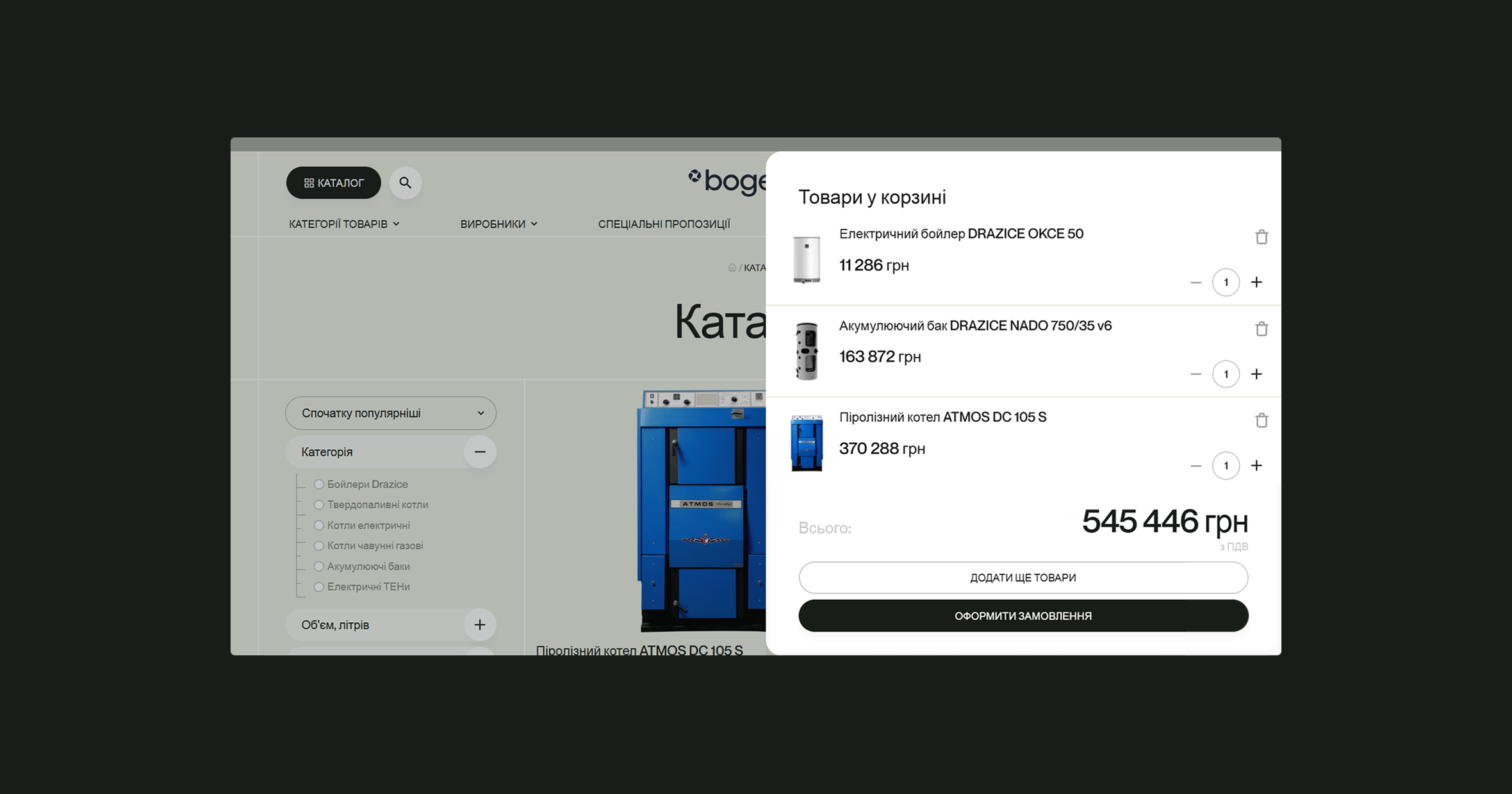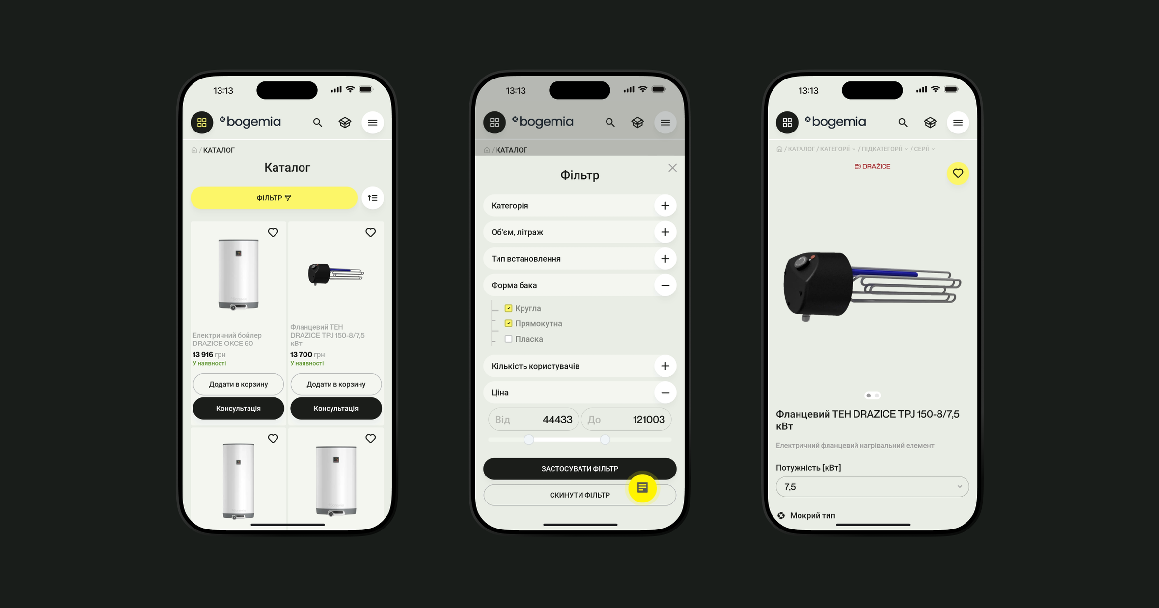 На основі оновленого стилю ми розробили UI для каталогу, карток товарів, чек-ауту, акцій, банерів. Використовували патерни, акцентні кольори, мікроанімації, щоб інтерфейс виглядав сучасно, але не «грайливо» — щоб зберігати довіру, яку Bogemia має у B2B сегменті.