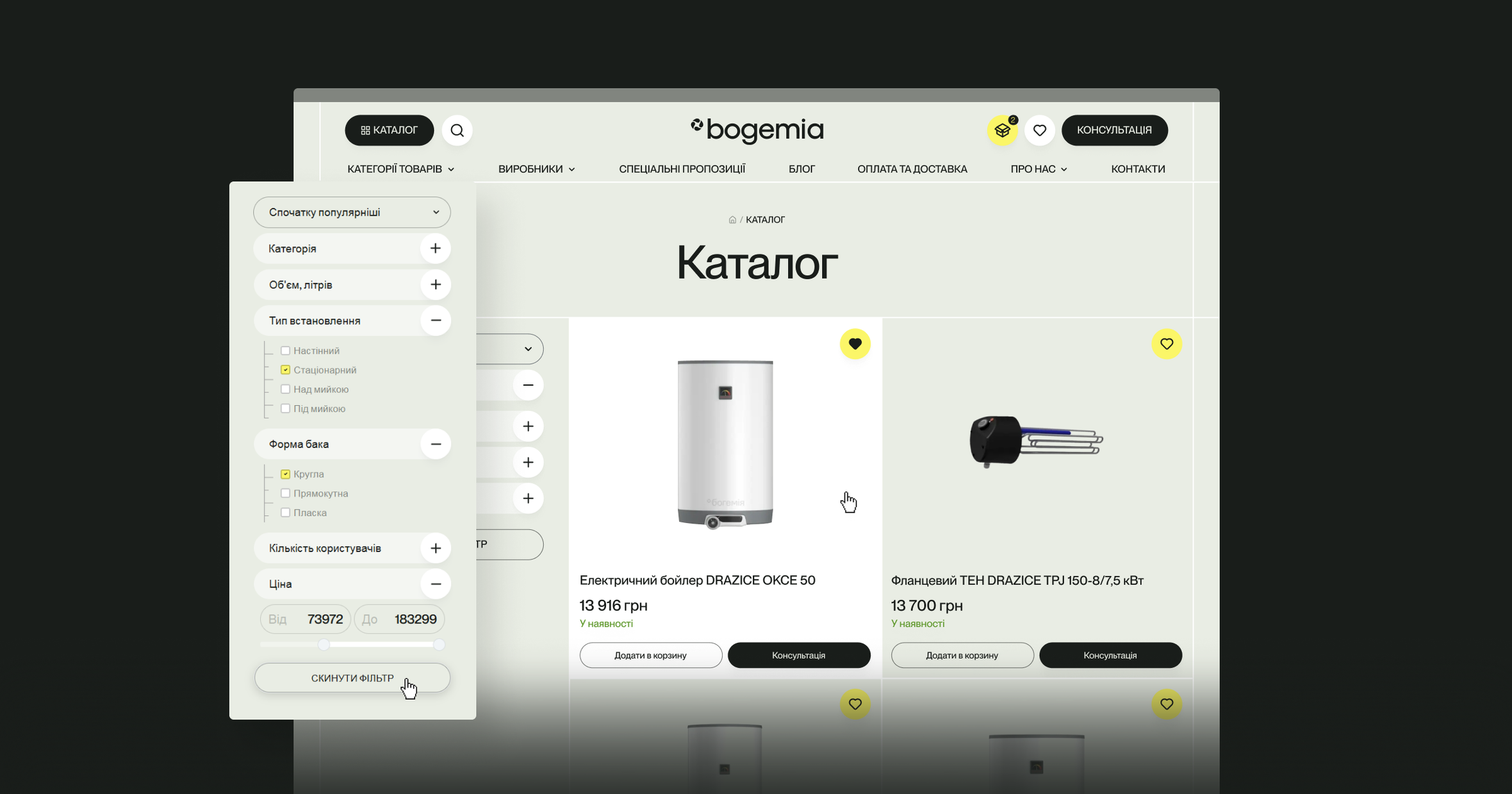 Команда Heads повністю реалізувала розробку Bogemia.ua — від фронтенду до інтеграції з CMS. Ми створили кастомні модулі для каталогу, фільтрації, управління брендами та акціями.