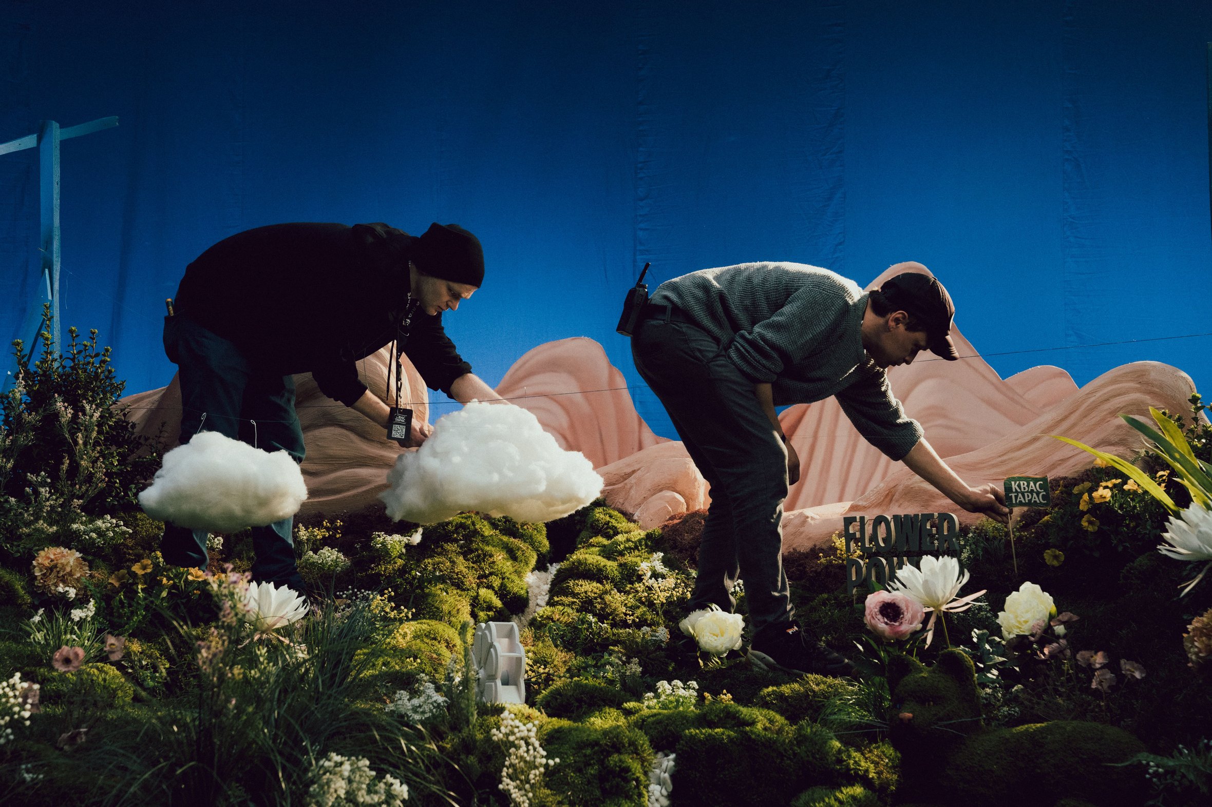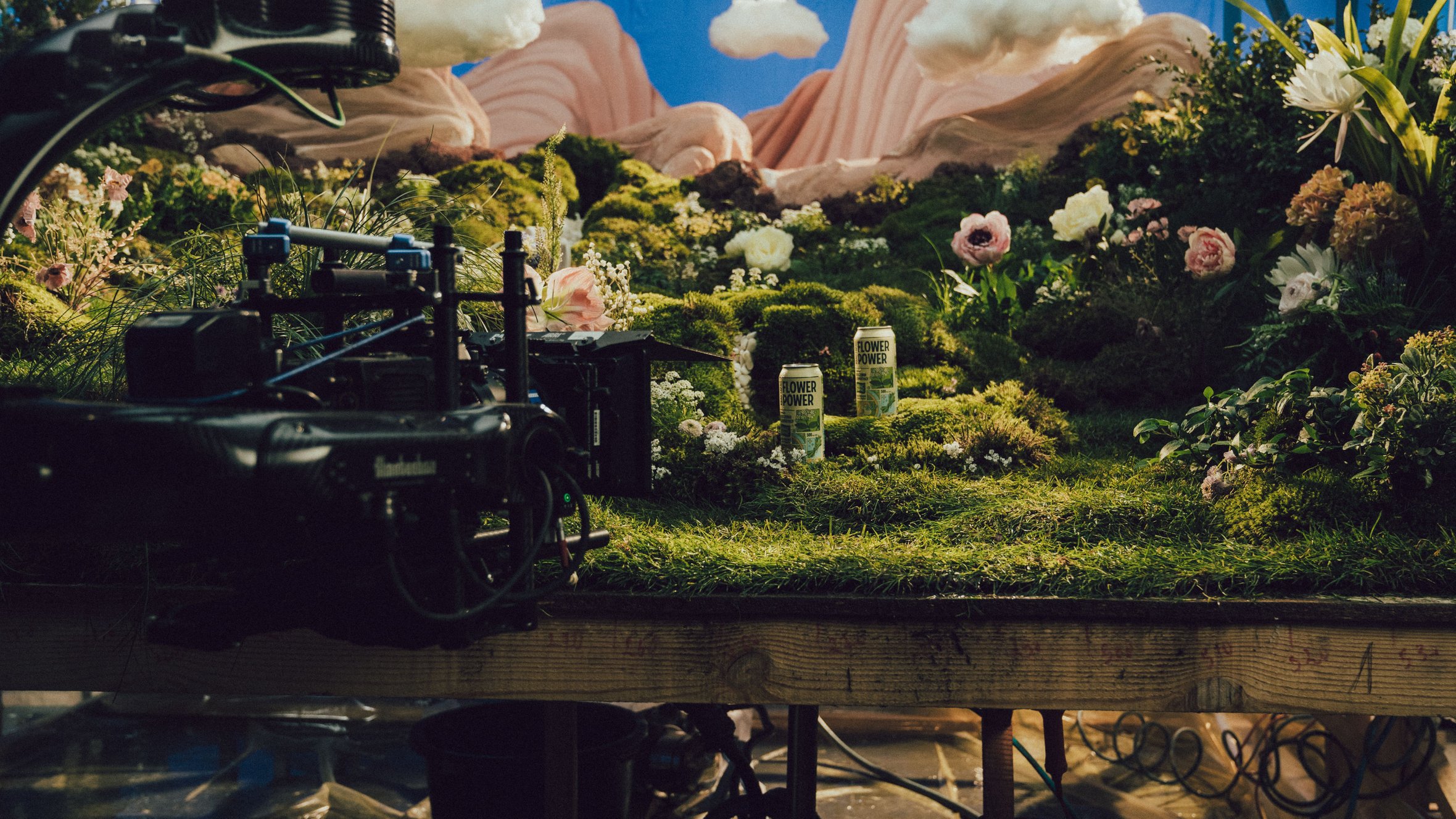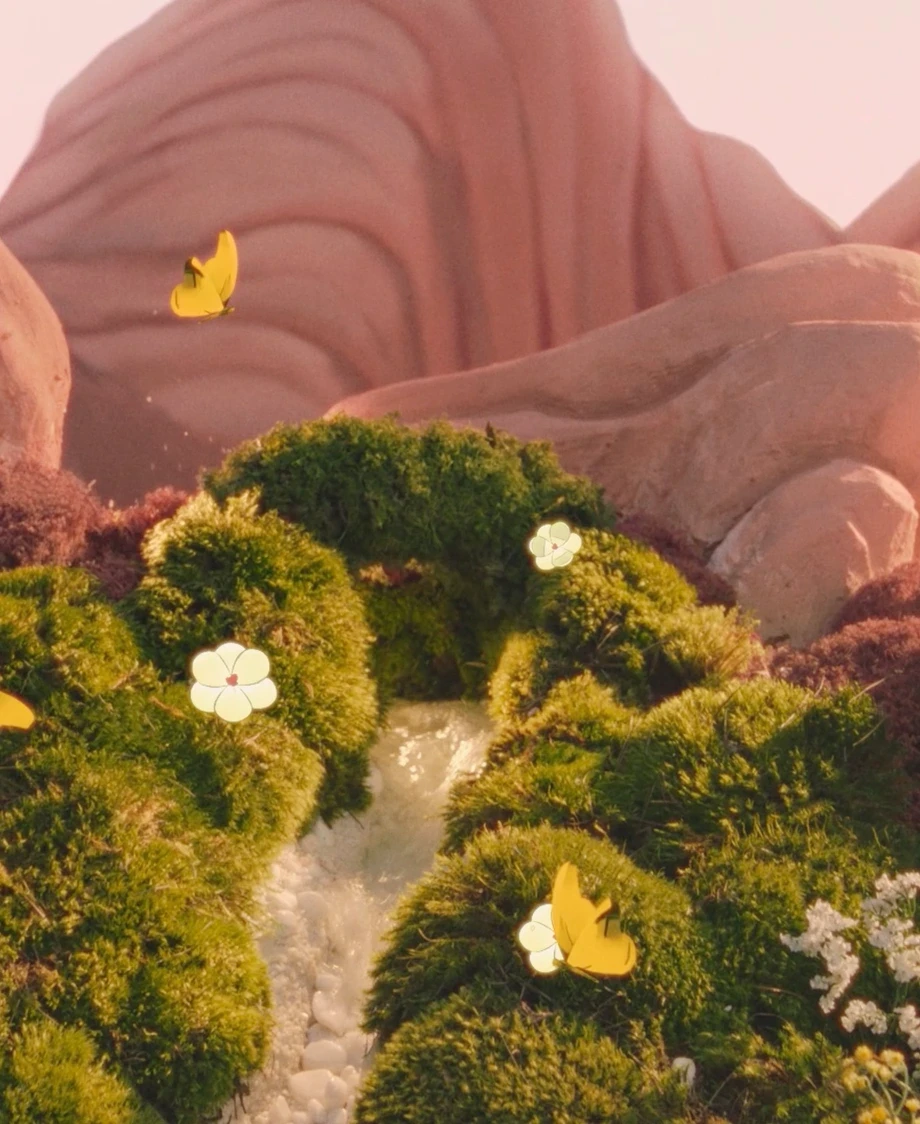 Весь ролик — мікс театральності та натуральності. Тому ми бачимо незліченну кількість живих квітів, проте домальованих метеликів із дитячих мультфільмів. Бачимо величезні рожеві гори і бавовняні хмаринки. Маємо кото-куща, який теж герой ролика й має, що сказати.