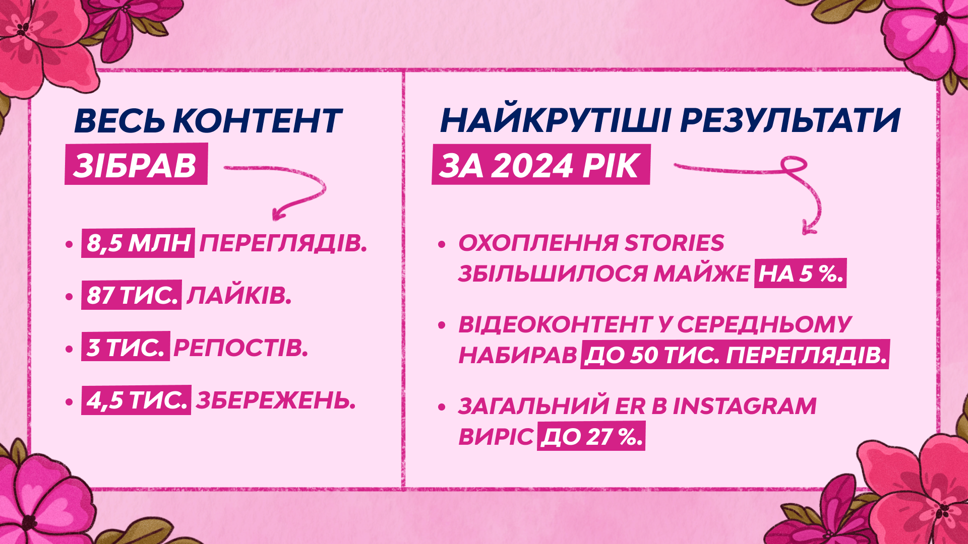 У 2024 році ми опублікували 108 дописів і 72 сети Stories. Охоплення сягнуло майже 29 млн унікальних користувачів.
