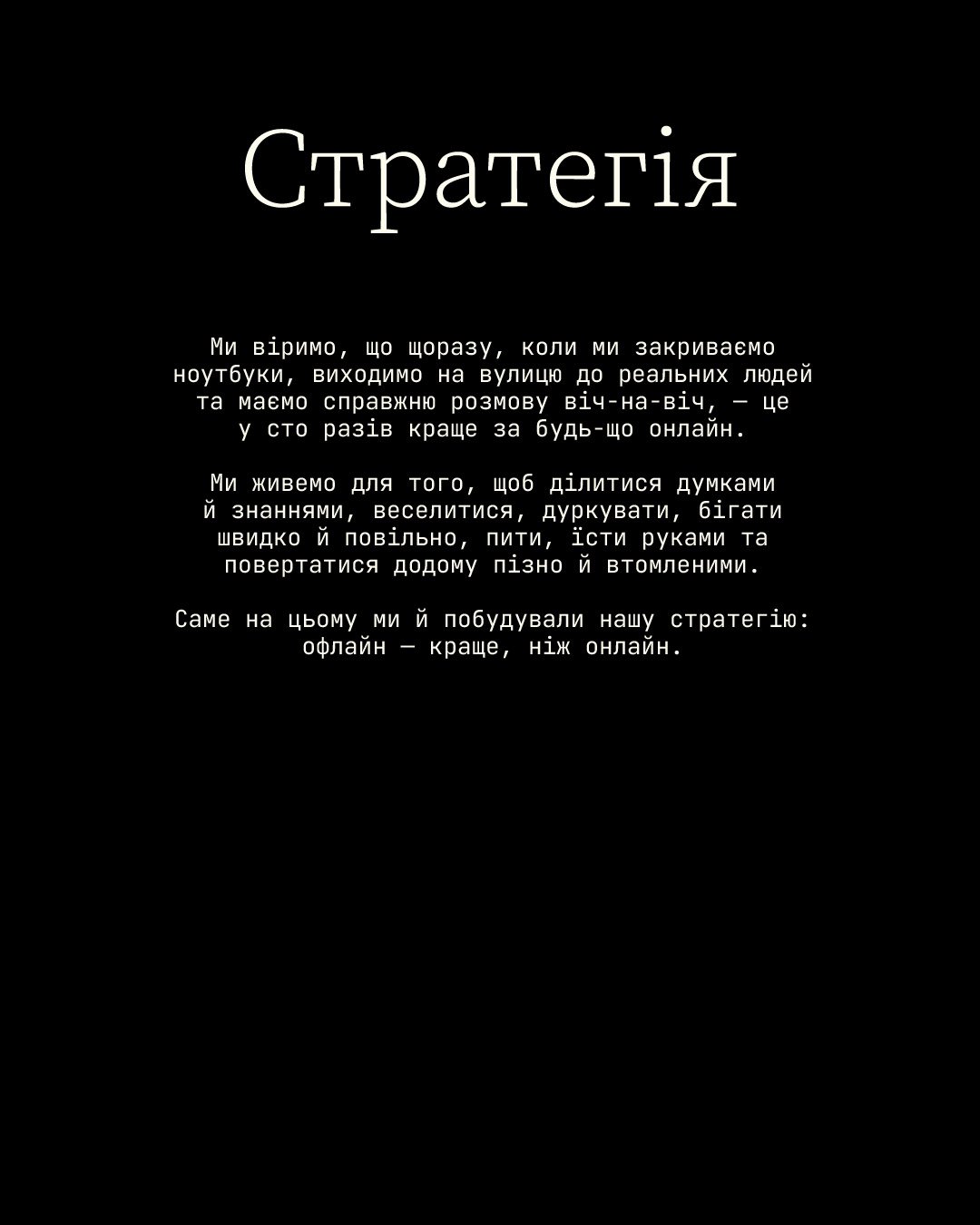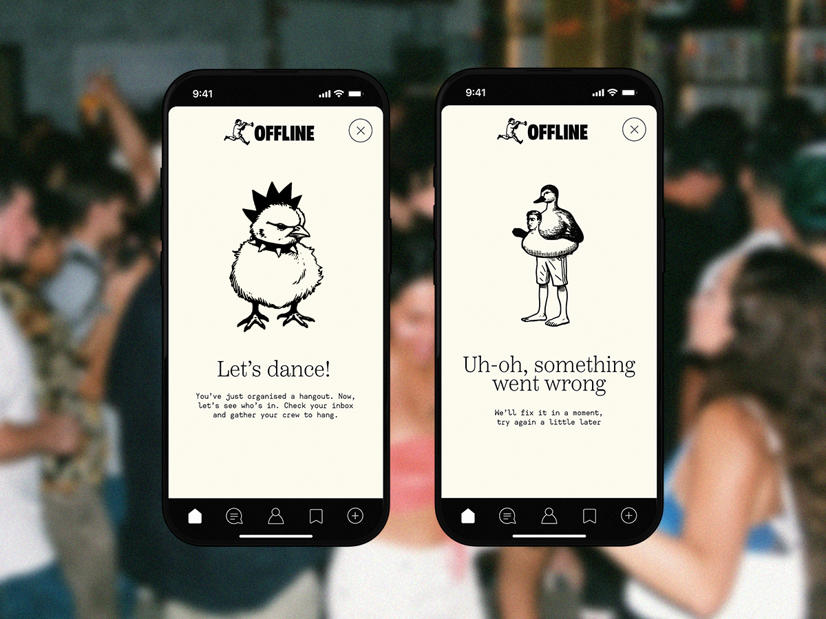 Завданням було створити бренд повністю з нуля — сформувати стратегію, придумати назву застосунку та побудувати цілісну айдентику. Від позиціонування й тону голосу до дизайн-системи — кожен елемент було продумано так, щоб підтримати місію Offline: допомагати людям проводити час разом у реальному житті, а не перед екранами.