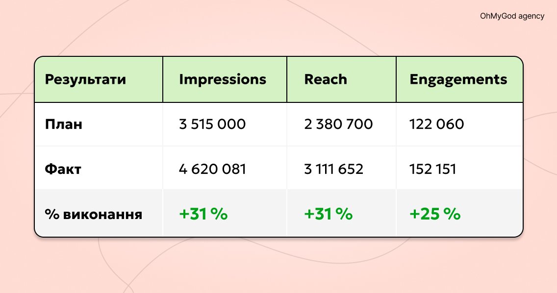 Кампанія перевиконала всі KPI: охоплення, покази та взаємодії перевищили план на 25–31 %. Це стало результатом правильно обраної стратегії — простий, натуральний контент без зайвого рекламного тиску.