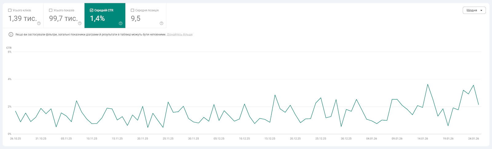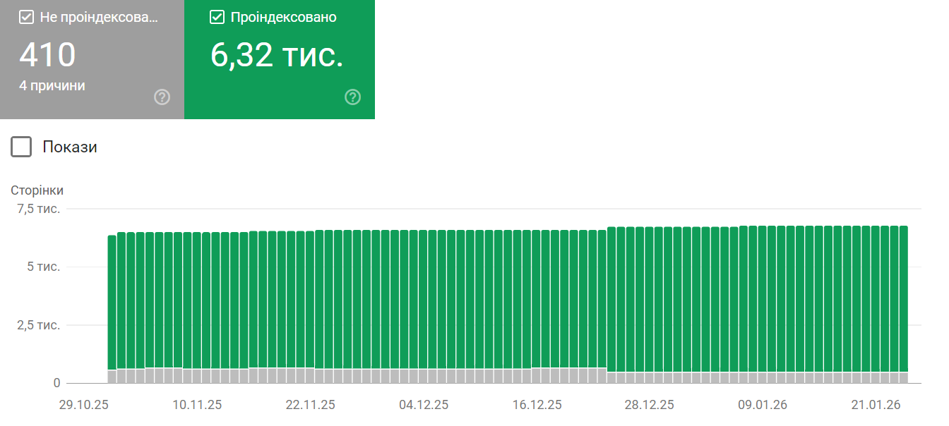 Зараз 95% сторінок сайту проіндексовано, що позитивно впливає на видимість в пошукових системах.