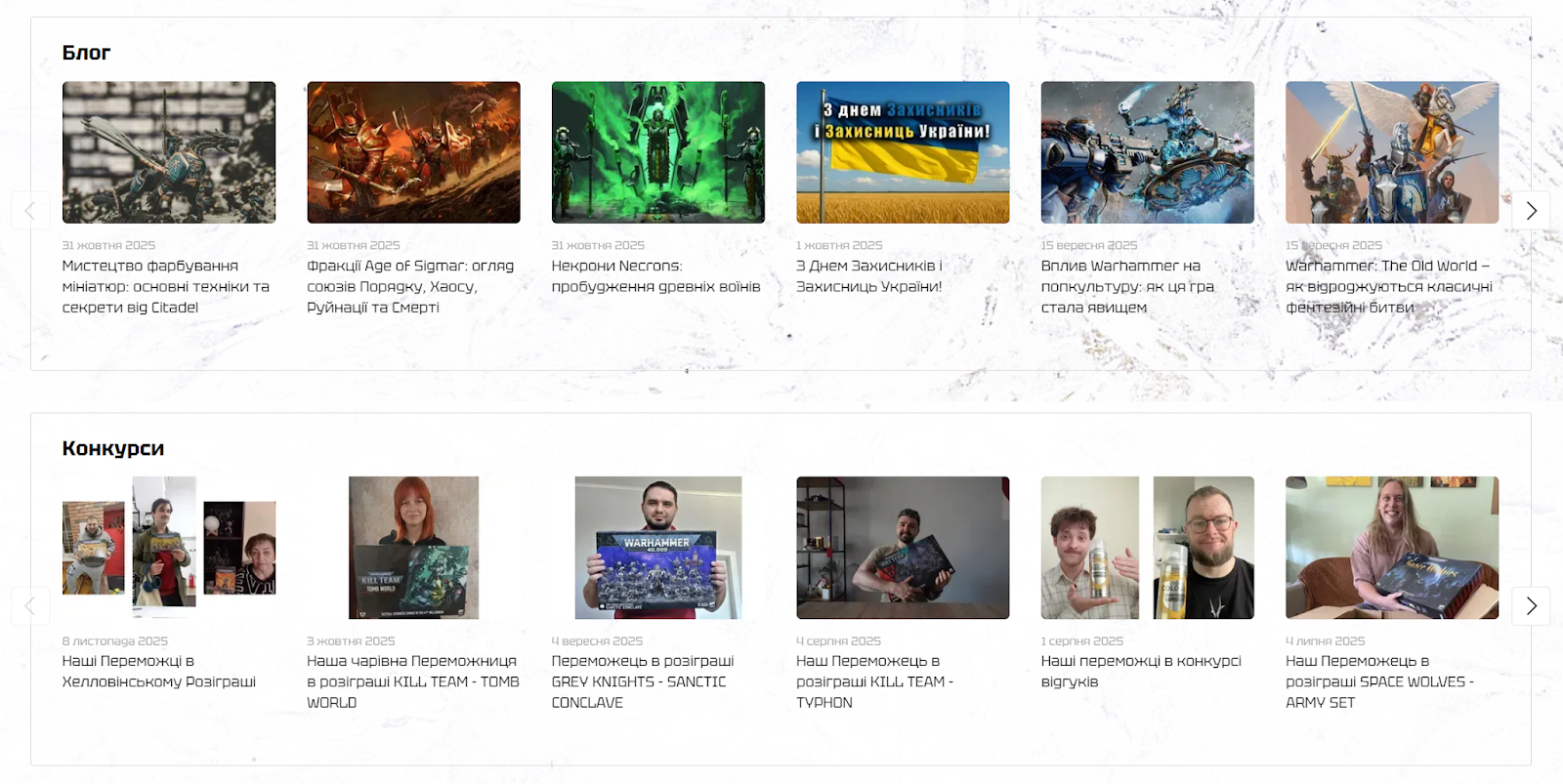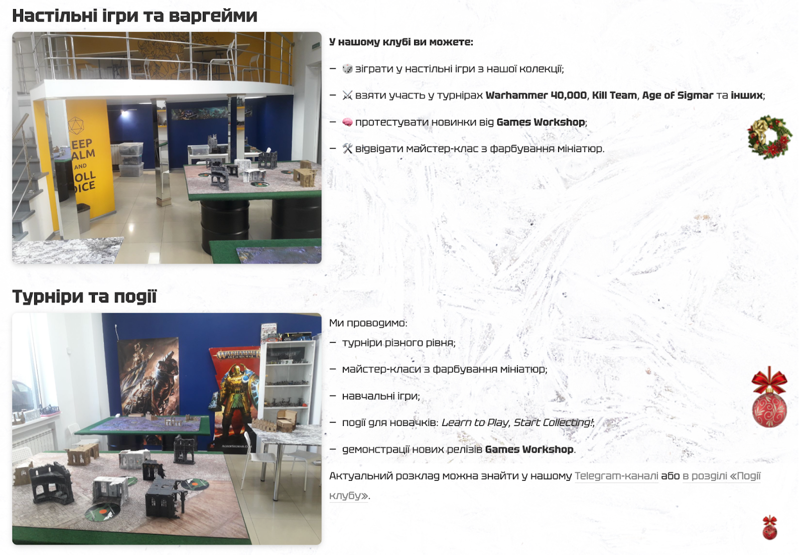 Також ми створили окрему сторінку для клубу настільних ігор, де детально описано всі можливості, що надаються відвідувачам. Ця сторінкастала точкою входу для всіх, хто шукає місце для гри в Warhammer у Києві.