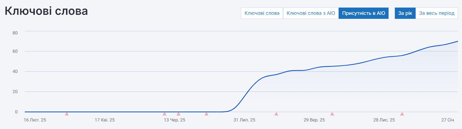 До впровадження цього стратегічного завдання ми мали 41%-44% ключових запитів у топ-1, після реалізації почалося різке зростання цього показника, досягнувши 73%-75% запитів.