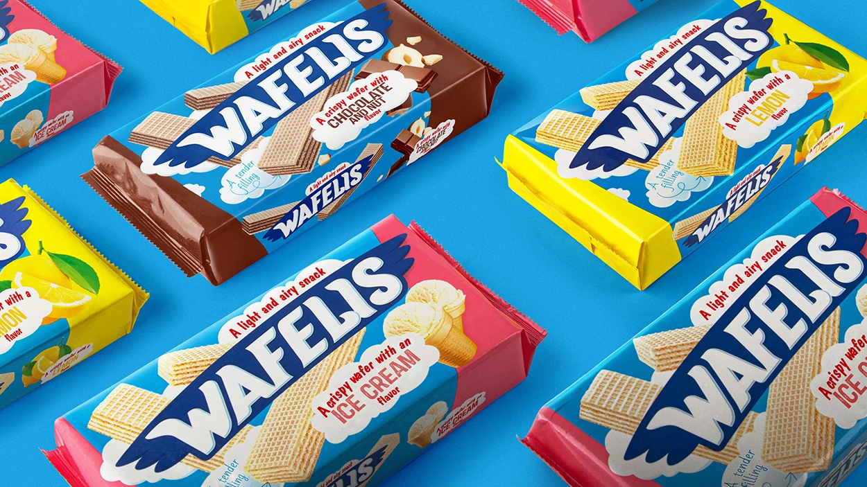 The project began with clarifying positioning and defining product qualities as the central idea. The active and dynamic WAFELIS logo sets a bold tone, while the bright packaging system clearly highlights flavors and attracts attention on the shelf.