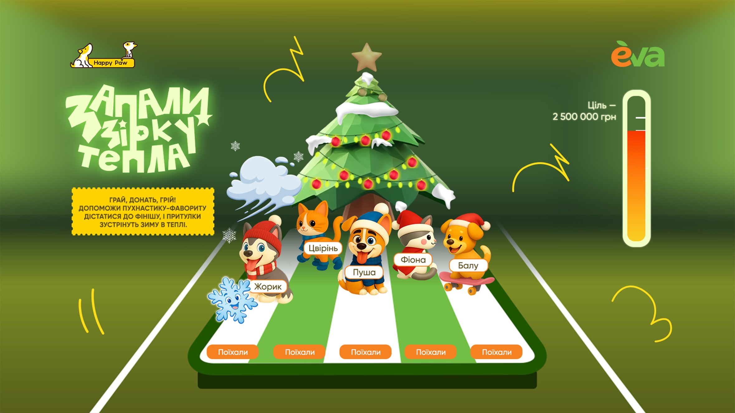 Долучитися до збору «Запали зірку тепла» можна було двома способами: через донати на касах магазинів EVA або на лендингу проєкту. В онлайн-форматі кожен учасник міг підтримати одну з п’яти тваринок-героїв у символічних перегонах до святкової ялинки.