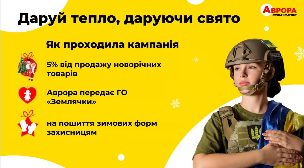 Саме з цієї ноти почалася минулорічна зимова кампанія «Даруй тепло, даруючи свято», у межах якої мережа «Аврора» передавала 5% від продажу новорічних товарів для ГО «Землячки». Мета — забезпечити зимовою формою жінок, які служать у лавах Сил оборони України.