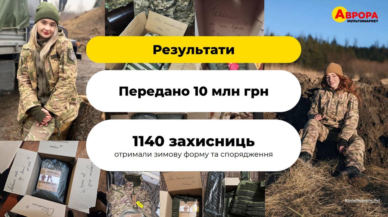 З 1 грудня 2024 року по 31 грудня 2024 року кожен покупець «Аврори» міг стати частиною доброї ініціативи. 5% від вартості новорічних товарів автоматично спрямовувалися на допомогу — зібрані понад 10 млн грн дали змогу закупити 1 140 комплектів зимової жіночої форми.