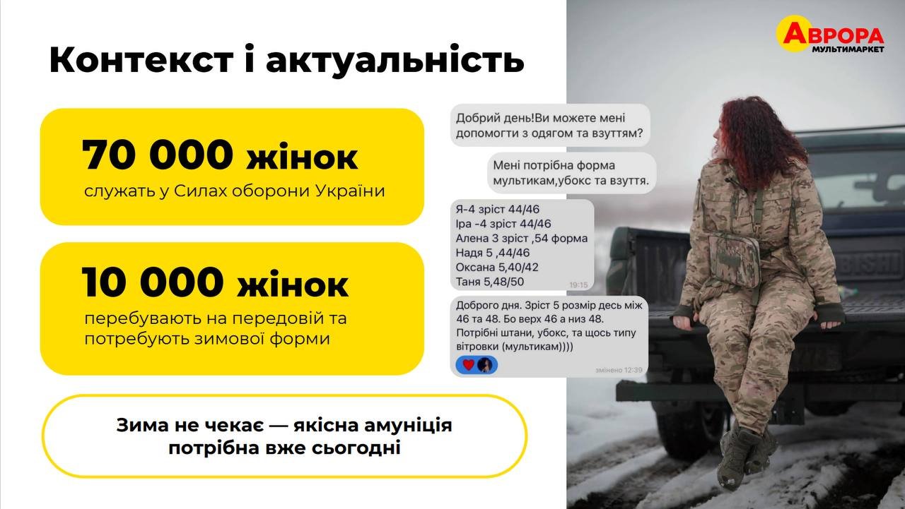 У війську України понад 70 000 жінок, і близько 10 000 з них перебувають у зоні бойових дій. Мережа «Аврора» підсилює діяльність ГО «Землячки», які розробили спеціальний фасон зимової форми й системно відправляють її на фронт, - Ксенія Драганюк співзасновниця ГО «Землячки»