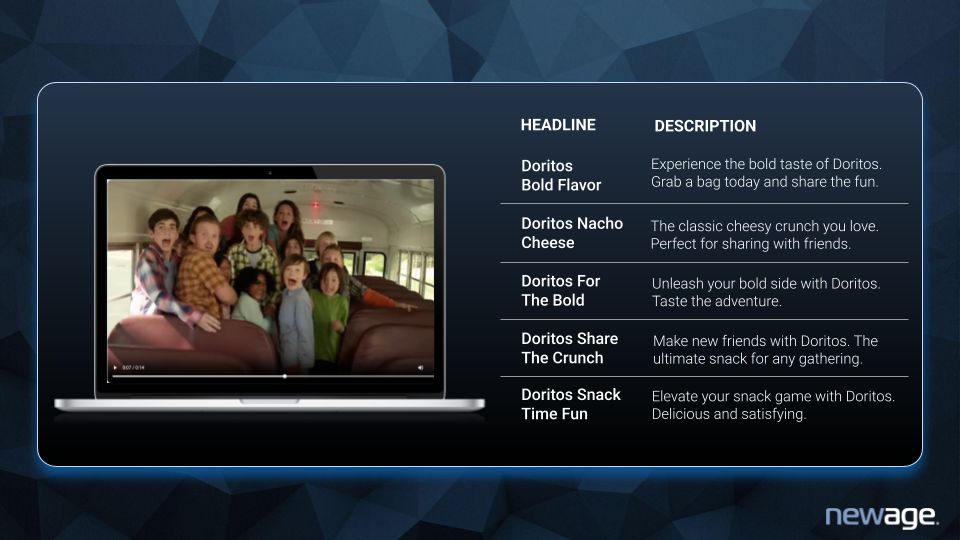 Після цього система автоматично генерує рекламні меседжі: Bold Flavor, Nacho Cheese, For the Bold, Share the Crunch, Snack Time Fun. Кожен варіант доповнюється готовим description, який можна одразу підставляти у YouTube Ads, Performance Max чи bumper-формати.