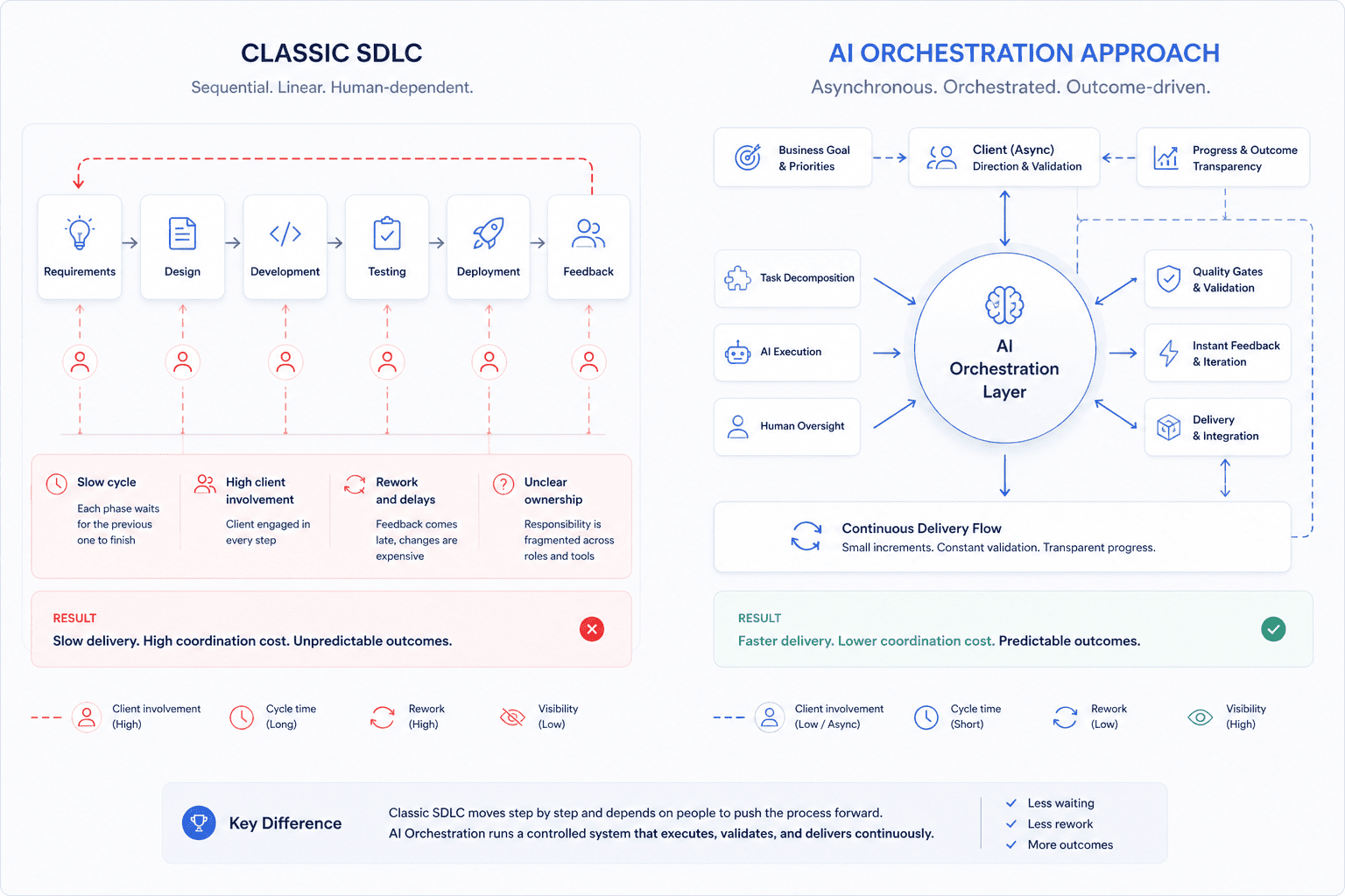 AI-orchestrated software development isn't a fundamentally different partnership model. The discovery phase is still discovery. Design is still design. Development, testing, and deployment remain. What changes is how AI integrates with each phase — and who or what is responsible for validating the output before the next phase begins.