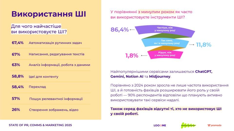 Переважно штучний інтелект використовують для автоматизації рутинних задач (67,4%), написання і редагування текстів (67%), аналізу інформації та роботи з даними (63%). Найпопулярнішими сервісами залишаються ChatGPT, Gemini, Notion AI та Midjourney.