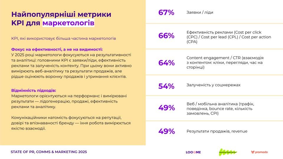 З огляду на специфіку діяльності, комунікаційники фокусуються на репутації, впізнаваності та довірі до бренду, тоді як маркетологів цікавлять вимірювані результати.