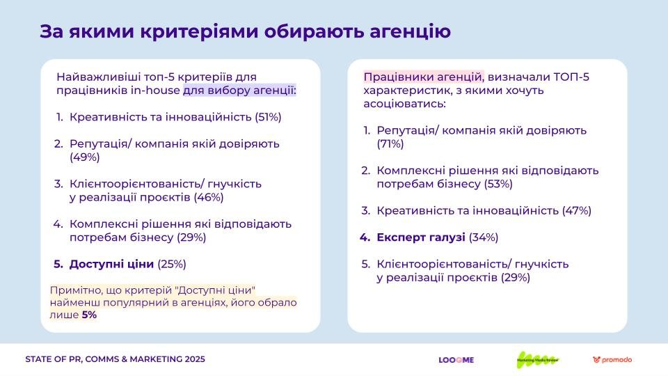 ТОП-5 критеріїв вибору агенції для працівників in-house: креативність та інноваційність, репутація, клієнтоорієнтованість, комплексні рішення під потреби бізнесу та доступні ціни.