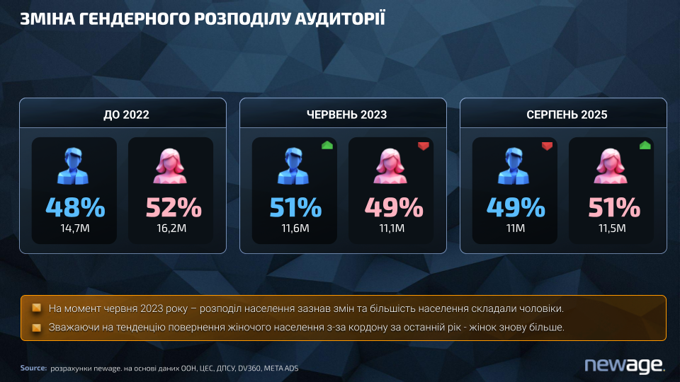 До 2022 року в Україні жінки складали більшість online-користувачів — 52% проти 48% чоловіків. Після початку повномасштабного вторгнення ситуація змінилася: частина жінок виїхала за кордон, а чоловіки, які залишилися в країні, сформували більшу частку активної digital-аудиторії.