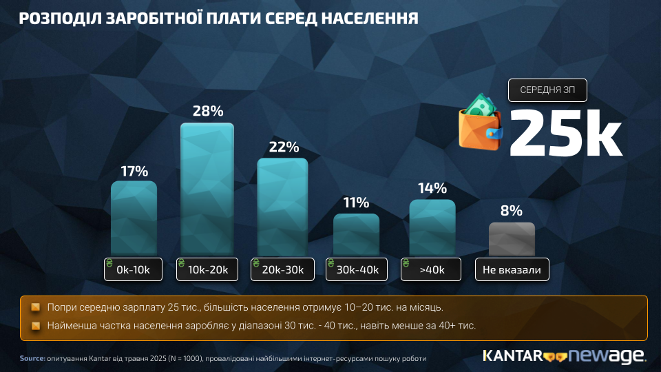 Попри те, що середня заробітна плата в Україні у 2025 році становить близько 25 000 грн, структура доходів є нерівномірною. За даними дослідження newage. спільно з Kantar, понад половина населення (45%) отримує менше 20 тисяч гривень на місяць.