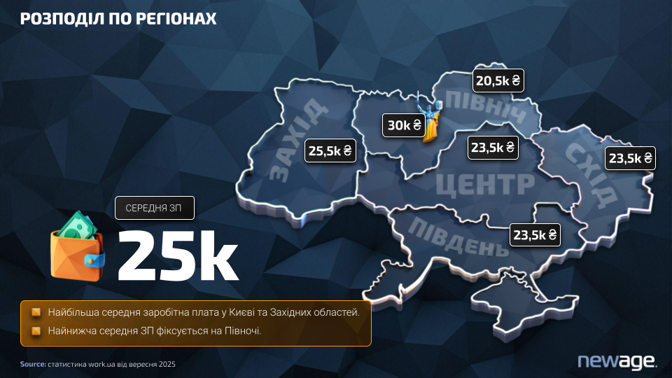 - найнижчі показники фіксуються на Півночі — близько 20 500 грн.