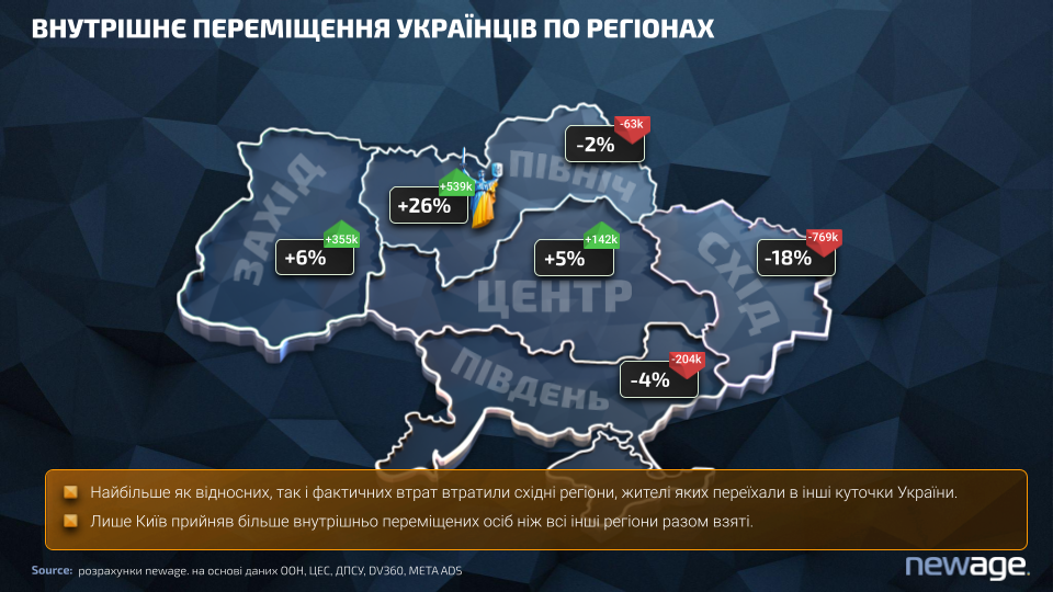 Водночас, 3,9 мільйона українців змінили місце проживання всередині країни. Це величезний обсяг внутрішньої мобільності, який вплинув на структуру digital-аудиторії — зокрема, на те, де тепер зосереджено користувачів з високим рівнем онлайн-активності.