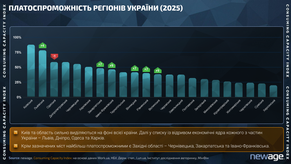 За даними індексу, Київ та Київська область залишаються безумовними лідерами — вони формують найвищий рівень платоспроможності в країні.
