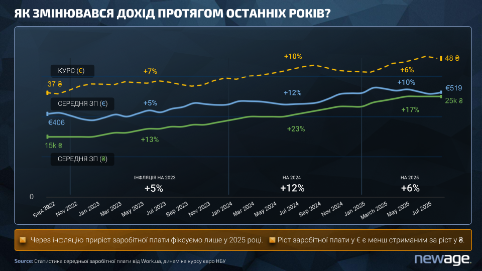 Хоча середня зарплата в Україні зросла з 15 000 грн у 2022 році до 25 000 грн у 2025, цей ріст не був лінійним. Дані Work.ua і динаміка куру євро НБУ показують: