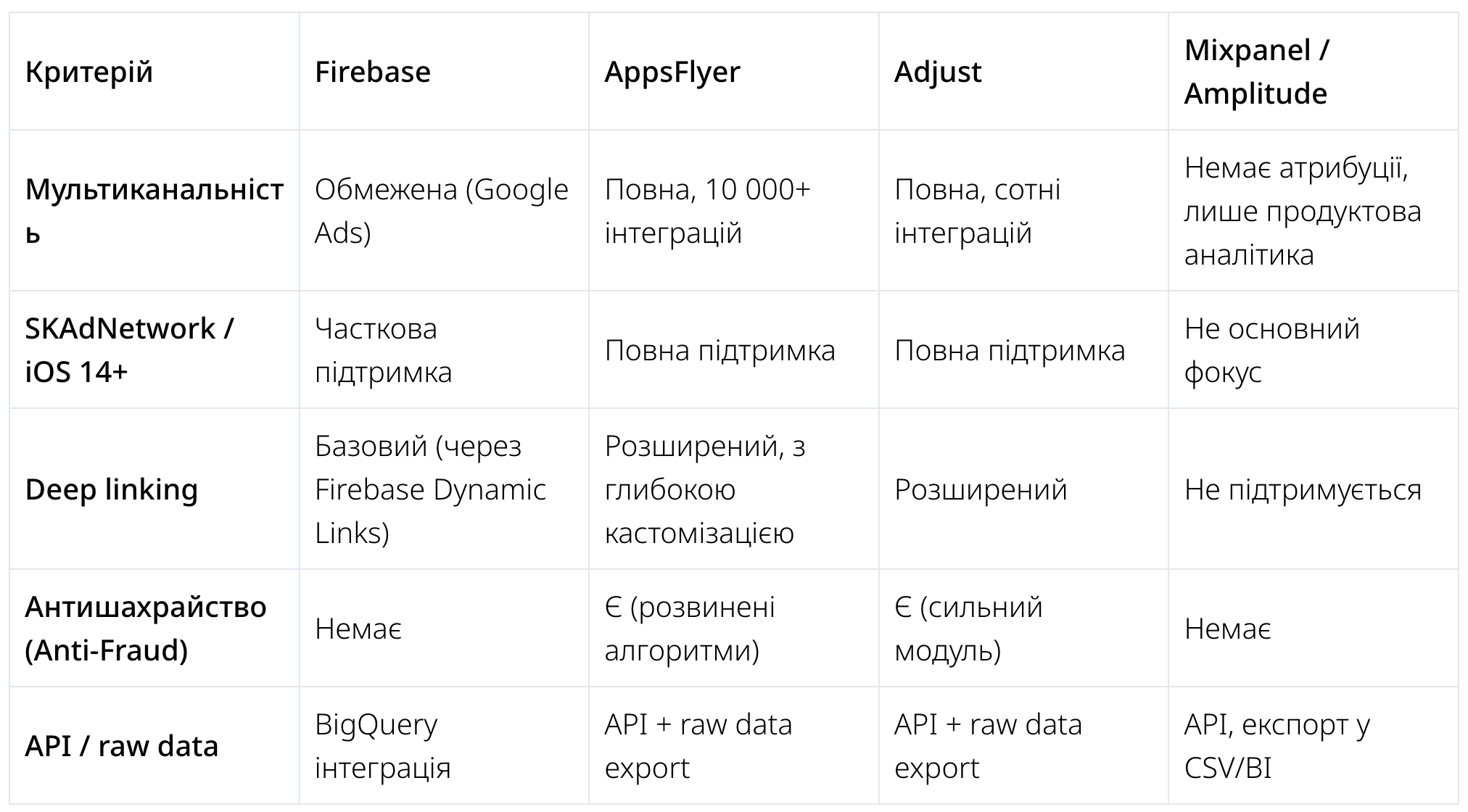 • Великі компанії та корпорації: оптимально комбінувати AppsFlyer + Firebase (або Adjust + Mixpanel/Amplitude), щоб отримати повний цикл: від атрибуції до глибокої продуктової аналітики.