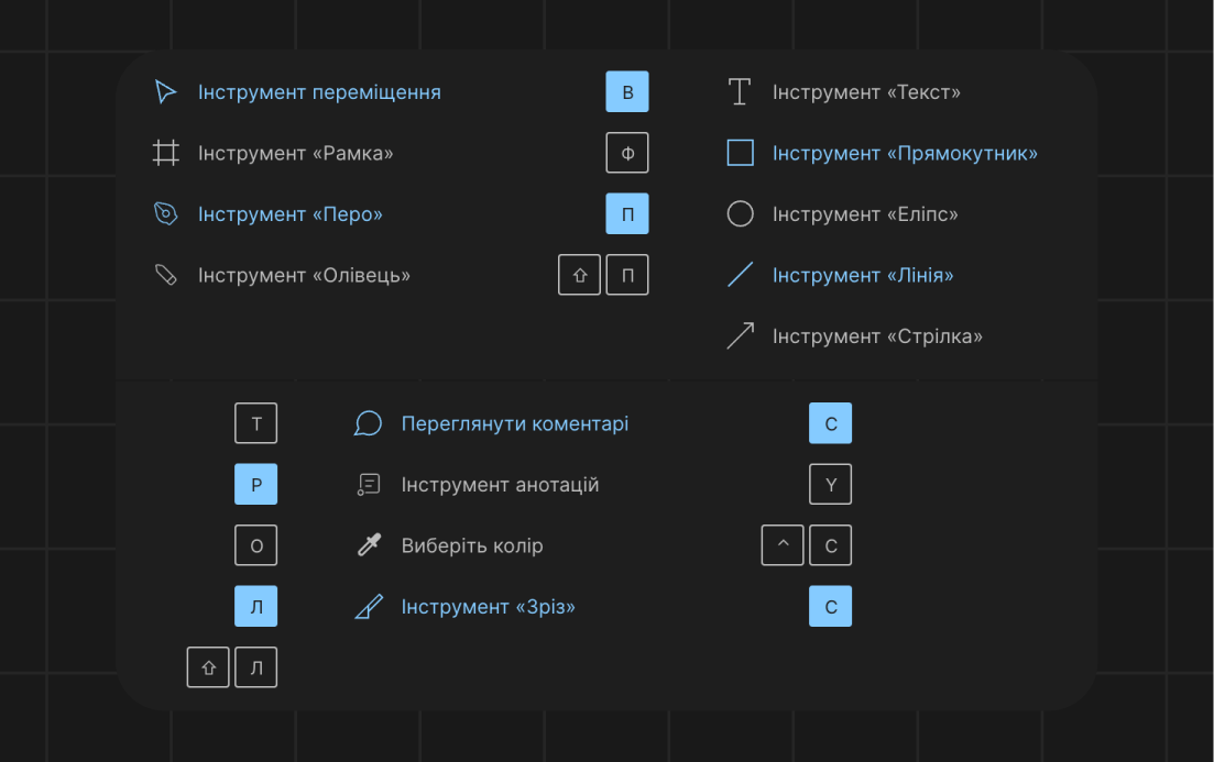 Після цього відкриється вікно, де інструменти та їхні гарячі клавіші розкладені по поличках.