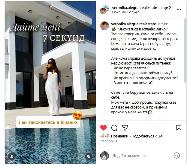 • Кейс. Розкажіть історію клієнта у форматі: «Було — Стало». «Мріяли про Іспанію — тепер живуть тут». Такі відео викликають емоції та довіру, бо показують реальні результати.