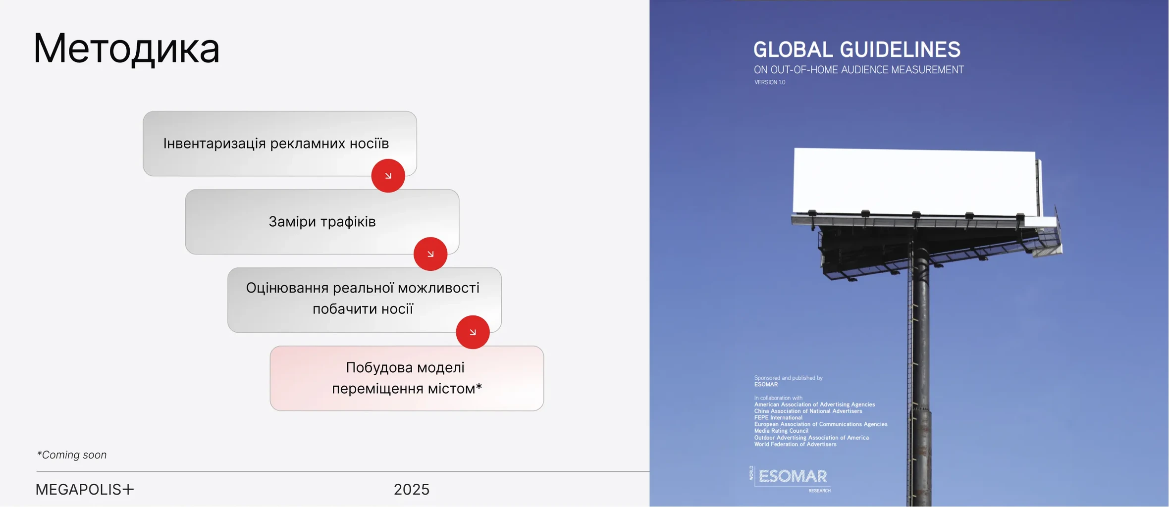 «Щоб ринок розвивався, він має працювати з реальністю, а не з архівами. Ми інвестували у відновлення галузевих досліджень, щоб дати ринку свіжі, достовірні дані для планування. І принципово відкриваємо ці результати для всієї індустрії — безплатно. Ми спиралися на методологію, погоджену Індустріальним комітетом зовнішньої реклами ще до 2022 року — щоб ринок міг довіряти кожній цифрі», Віктор Іванченко, Head of Strategy & R&D Megapolis+.