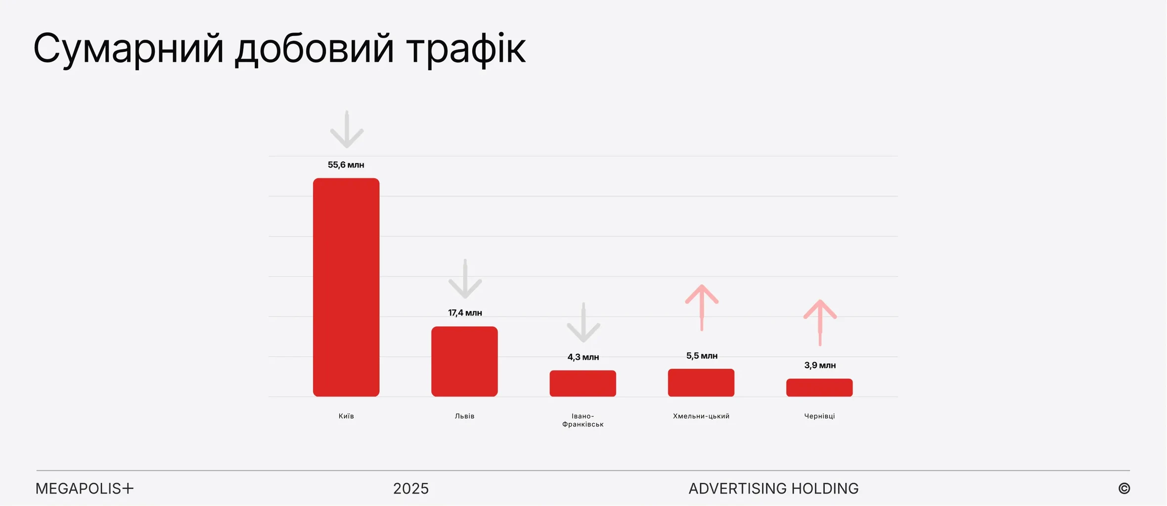 У деяких містах (як-от Хмельницький і Чернівці) сумарний добовий трафік збільшився, що відображає зміну моделей переміщення мешканців — куди вони їздять, де працюють і де проводять час. Натомість у великих містах — Києві, Львові, Івано-Франківську — спостерігається несуттєве зменшення, що підкреслює потребу в оновленому підході до планування кампаній.