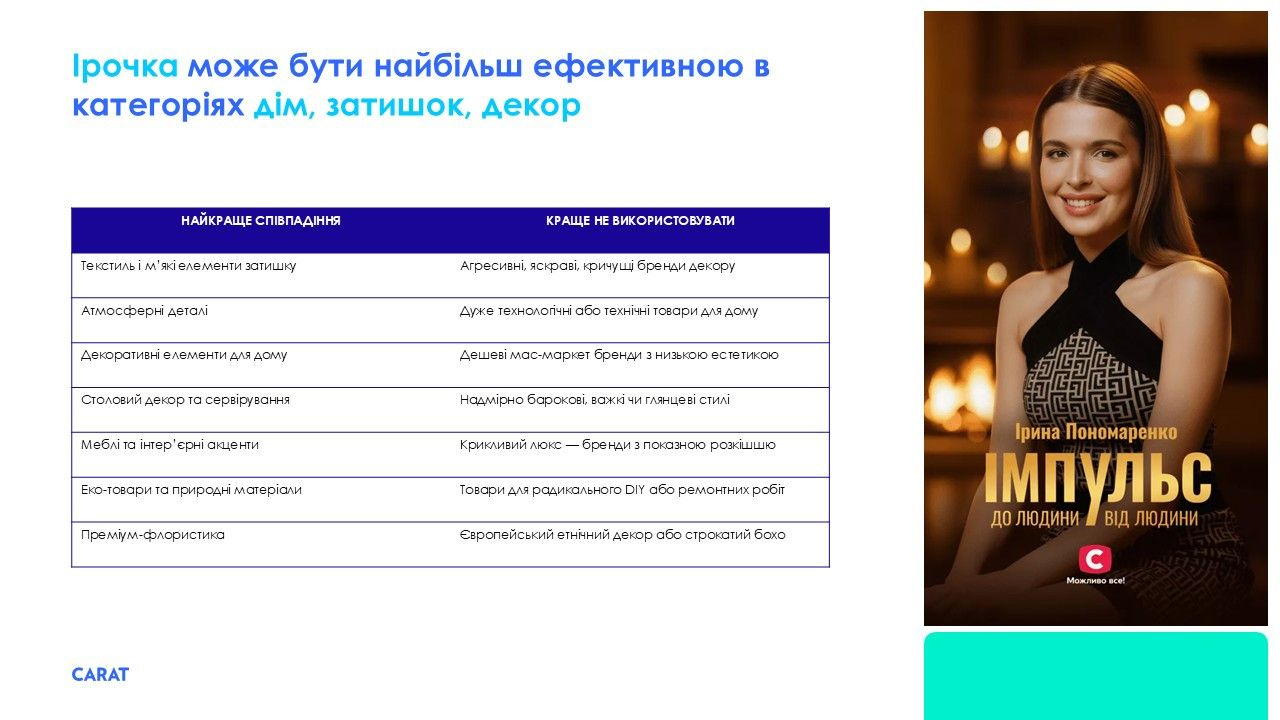 Улюблениця глядачів Ірочка за результатами тестів була би найбільш органічною для брендів із категорій дім, затишок, декор. Ключові характеристики — спокій, елегантність, гармонійність, увага до деталей, сімейні цінності.Наприклад, скандинавським брендам варто придивитися до потенційних колаборацій з Ірочкою.