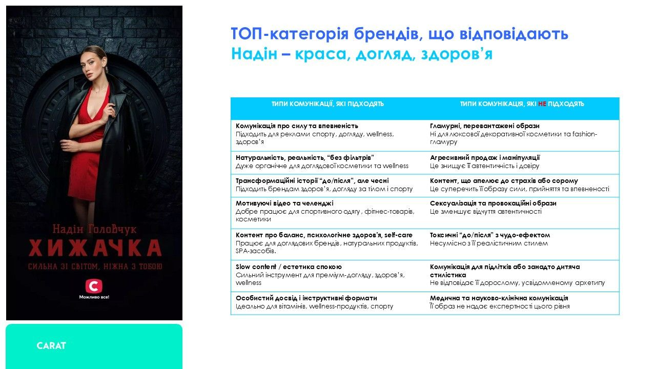 Для переможниці шоу Надін, ТОП-категорією за можливістю привернення уваги до бренду є краса, догляд, здоров’я. Найкращий тандем вийде з брендами, які комунікують про регулярну здорову рутину, використовують мотивуючі відео та челенджі, транслюють естетику спокою. Невдалою буде колаборація, у якій бренд очікуватиме від Надін перевантажених екстра-глянцевих образів, апелювання до надмірної сексуалізації, інфантильної стилістики або науково-медичного формату – усі ці образи будуть виглядати неприродно і не дозволять сформуватися синергії.