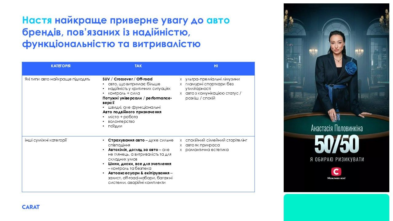 Фіналістка Настя Половинкіна з великою перевагою, за результатами тестування, найкраще представлятиме бренди із категорії авто. Її психологічний портрет найбільше відповідає героїні дії на противагу героїні пасивної краси. Найкращими будуть варіанти комунікації, в яких є драйв, ризик, швидкість, рішучість, екшн-сценарії, безпека, активний спосіб життя, подорожі, екстрим. Найменш вдалими образами будуть - лайфстайл-мама та тиха преміум-леді.